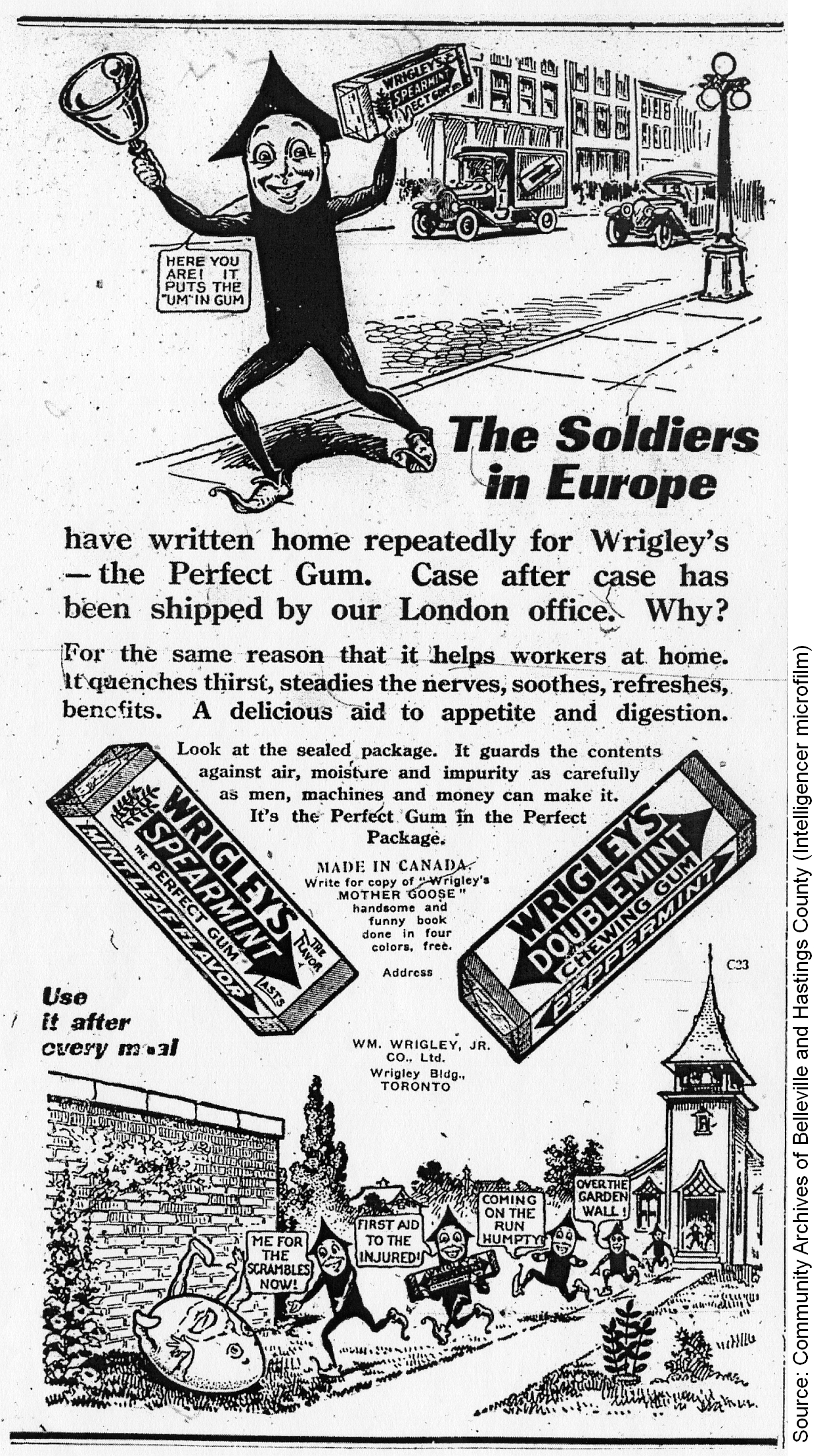“The Soldiers in Europe have written home repeatedly for Wrigley’s—the Perfect Gum. Case after case has been shipped by our London office. Why? For the same reason that it helps workers at home. It quenches thirst, steadies the nerves, soothes, refreshes, benefits. A delicious aid to appetite and digestion.