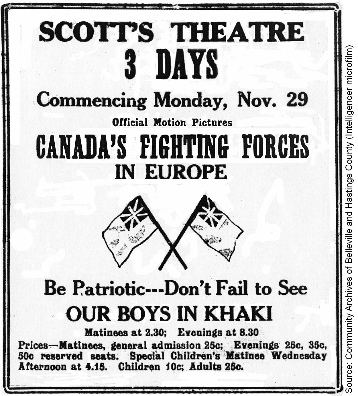 All true Canadians should see these films and give the boys who are now in the trenches, their hearty applause. These pictures will be shown in Scott’s Theatre, Monday, Tuesday and Wednesday, November 29, 30 and December 1st. Matinee Daily at 2.30. Prices, evening, 25¢, 35¢, and 50¢. All seats reserved. Matinees’ general admission 25¢.”