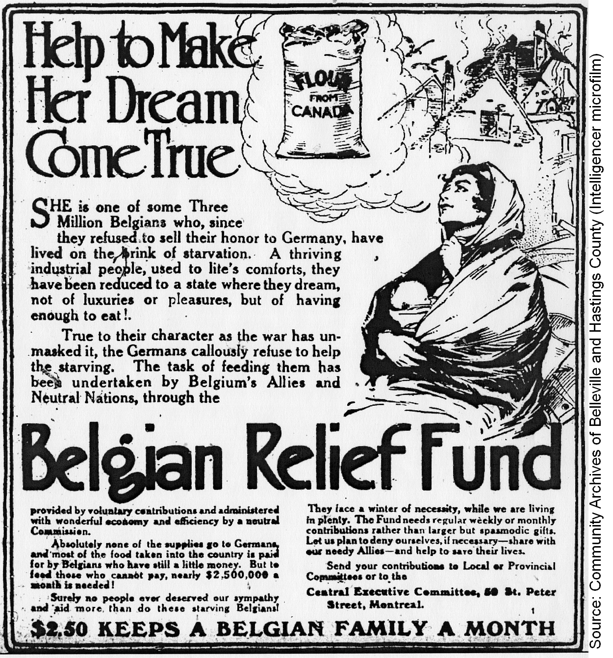 “Help to Make Her Dream Come True. She is one of some Three Million Belgians who, since they refused to sell their honor to Germany, have lived on the brink of starvation. A thriving industrial people, used to life’s comforts, they have been reduced to a state where they dream, not of luxuries or pleasures, but of having enough to eat! True to their character as the war has unmasked it, the Germans callously refuse to help the starving. The task of feeding them has been undertaken by Belgium’s Allies and Neutral Nations, through the Belgian Relief Fund. … $2.50 Keeps a Belgian Family a Month.”