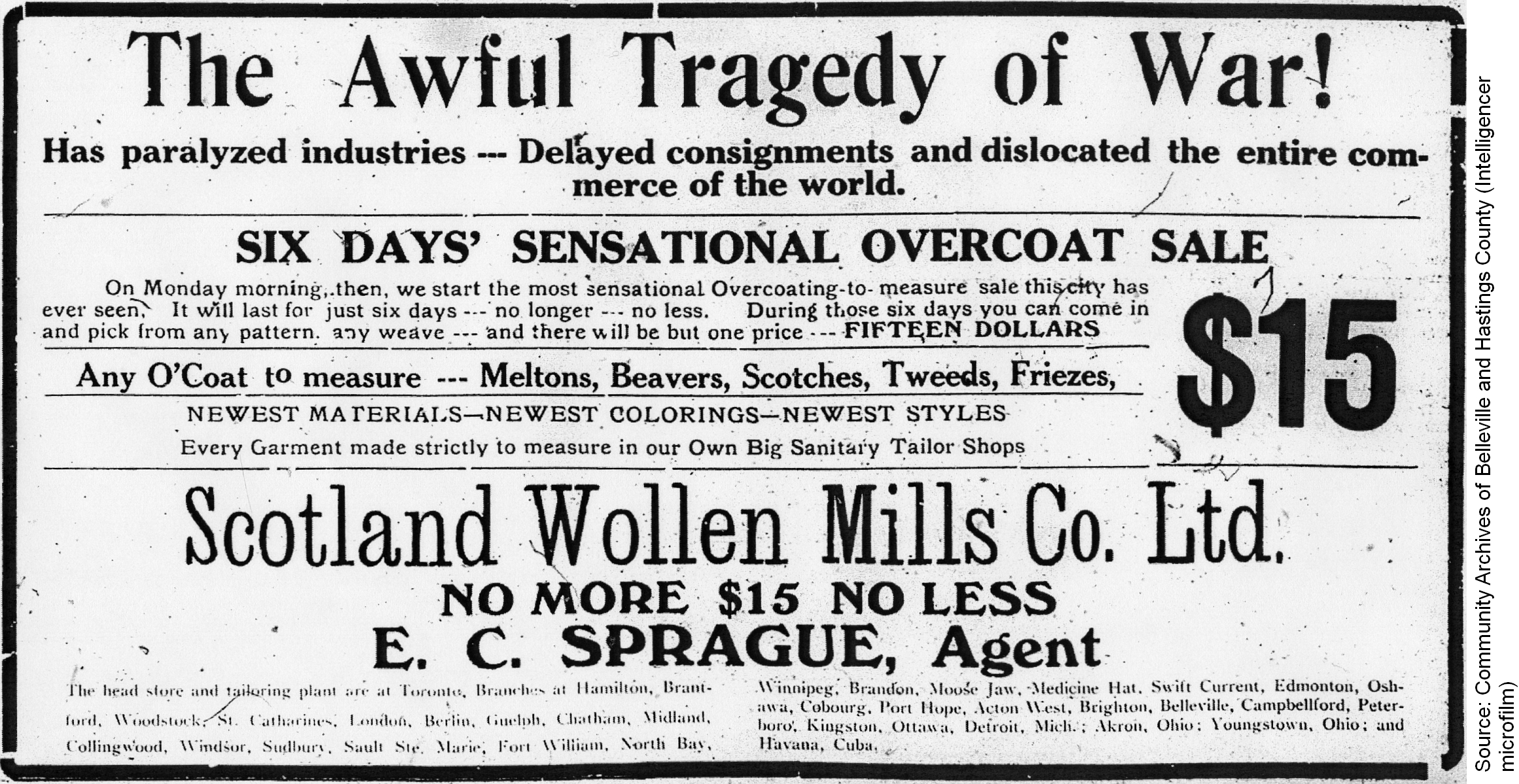 “The Awful Tragedy of War! Has paralyzed industries — Delayed consignments and dislocated the entire commerce of the world. Six Days’ Sensational Overcoat Sale. Any O’Coat to measure — Meltons, Beavers, Scotches, Tweeds, Friezes. Scotland Woollen Mills Co. Ltd. No More $15 No Less. E.C. Sprague, Agent.”