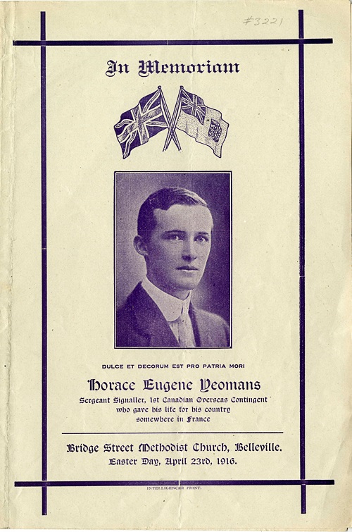 “Memorial Service At Bridge St. Church. A memorial service, very impressive in its nature, was held in Bridge street Methodist church, in this city, yesterday morning, for the late Sergt. Signaller Horace Eugene Yeomans, who a few days ago ‘somewhere in France’ sacrificed his young life in defence of King and country. It was a service that will linger long in the memory of the hundreds of citizens who were able to gather within the sacred precincts.