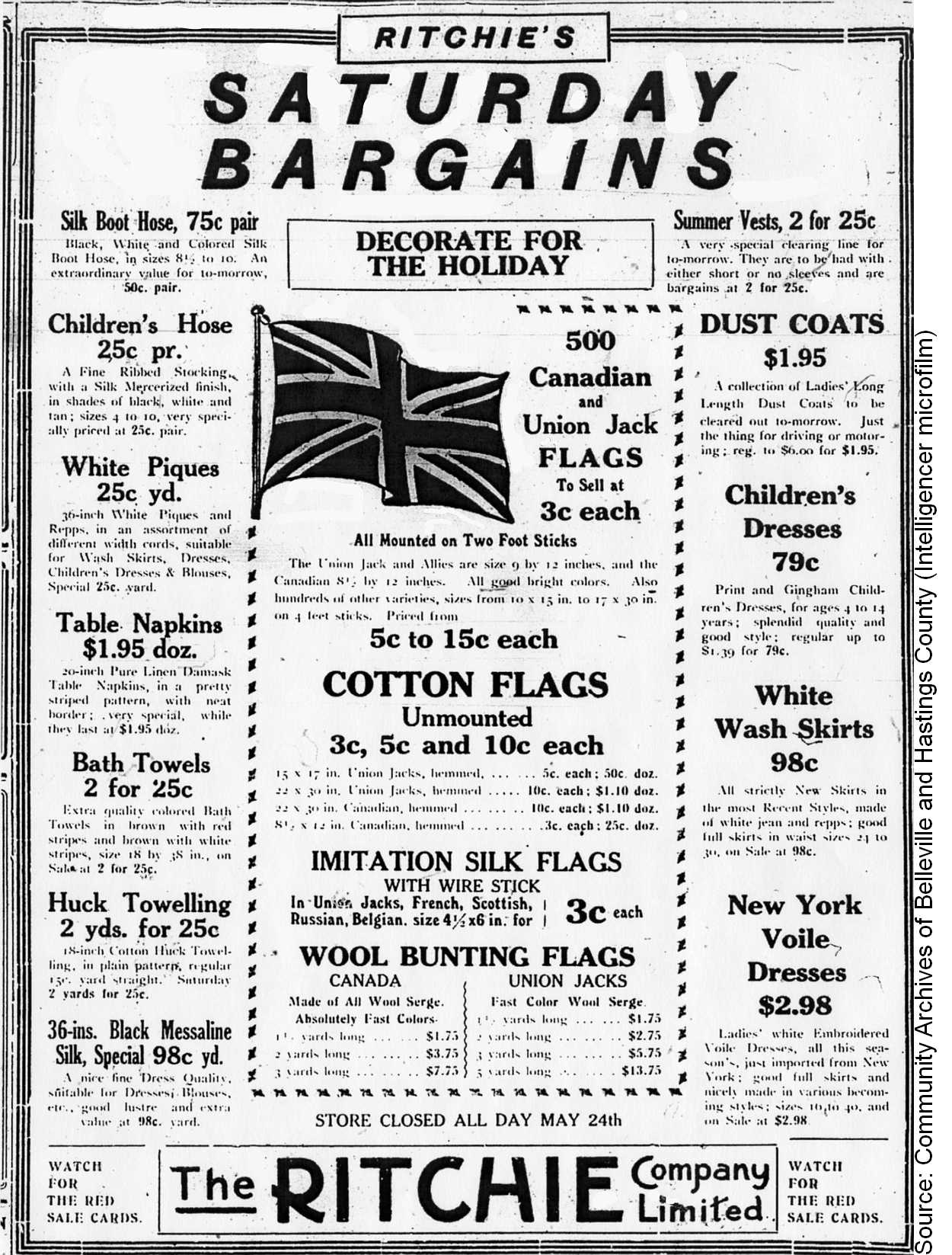 “Ritchie’s Saturday Bargains. Decorate for the Holiday. 500 Canadian and Union Jack Flags To Sell at 3¢ each. All Mounted on Two Foot Sticks. Cotton Flags. Imitation Silk Flags. Wool Bunting Flags.”
