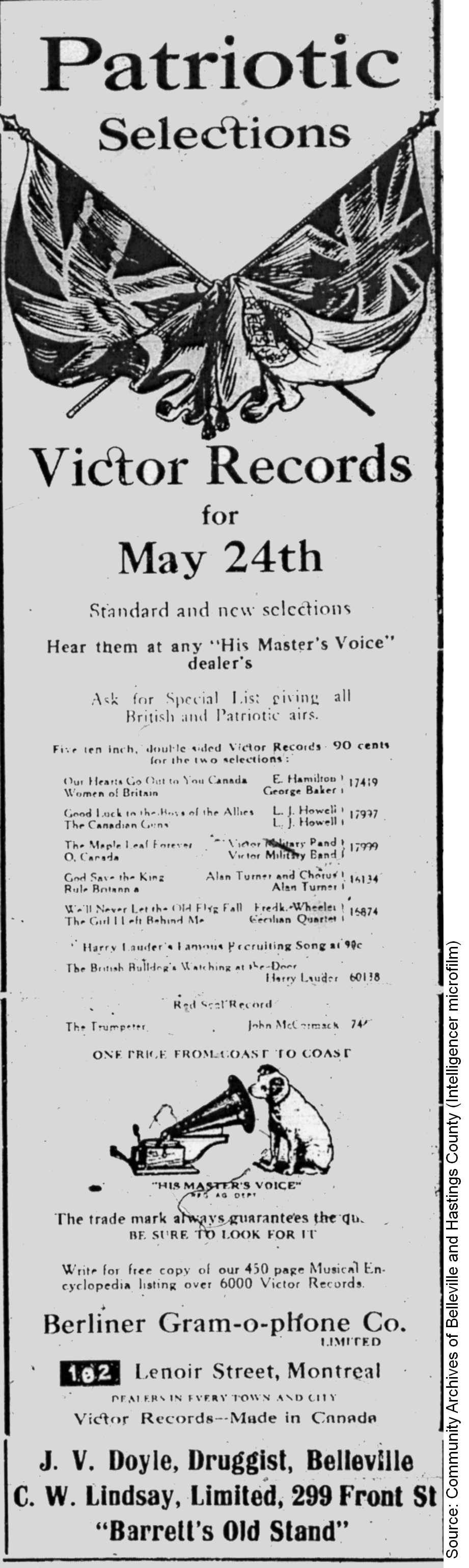 “Patriotic Selections. Victor Records for May 24th. Harry Lauder’s Famous Recruiting Song at 98¢. The British Bulldog’s Watching at the Door.