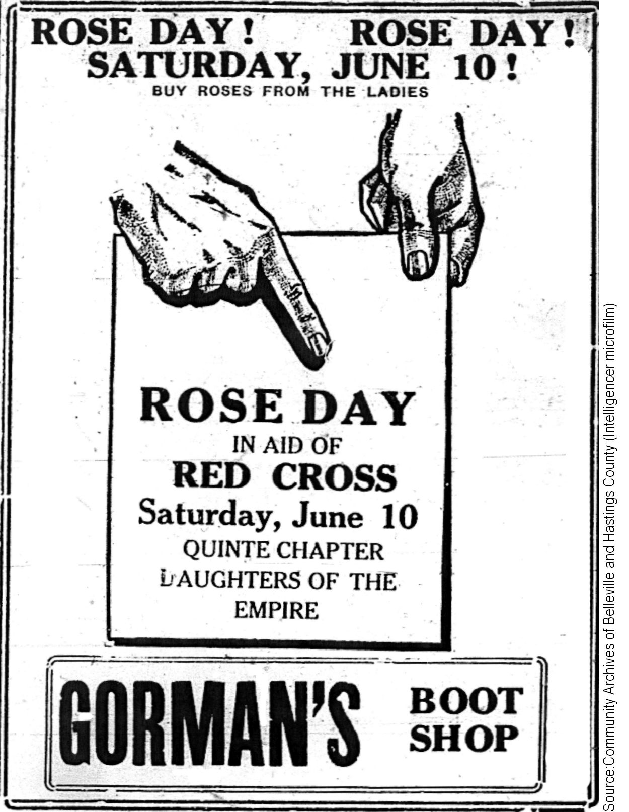 “Rose Day! Rose Day! Saturday, June 10! Buy Roses from the Ladies. Rose Day in Aid of Red Cross. Quinte Chapter Daughters of the Empire. Gorman’s Boot Shop.”