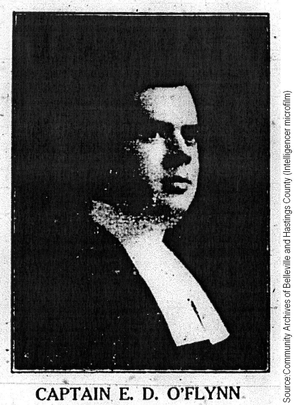 “Captain Eddie O’Flynn Wounded at Verdun. Citizens of Belleville last evening learned with deep regret that Capt. Eddie D. O’Flynn had been wounded, and numerous were the enquiries in reference to his injuries. It was a relief to his parents here and citizens generally when it became known that the brave young officer was not fatally injured.