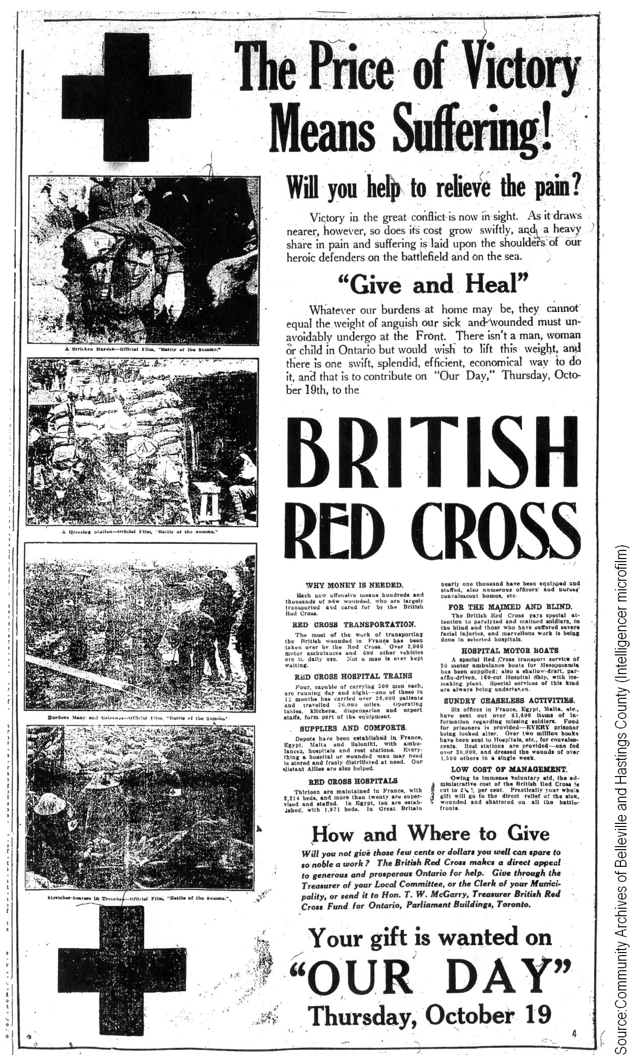 The British Red Cross needs millions of dollars to continue the work next year. Out of our abundance we can spare for a cause so worthy. Ontario will do well as each individual does his and her part. Remember the collection—October 19.”