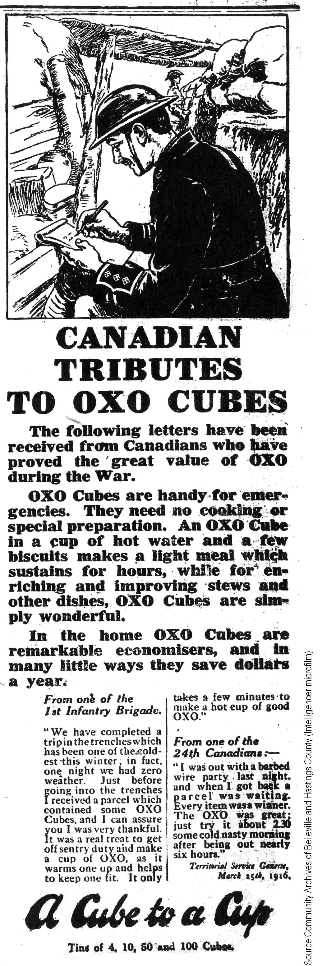 “Canadian Tributes to Oxo Cubes. The following letters have been received from Canadians who have proved the great value of OXO during the War. From one of the 1st Infantry Brigade. ‘We have completed a trip in the trenches which has been one of the coldest this winter. … I received a parcel which contained some OXO Cubes, and I can assure you I was very thankful.”