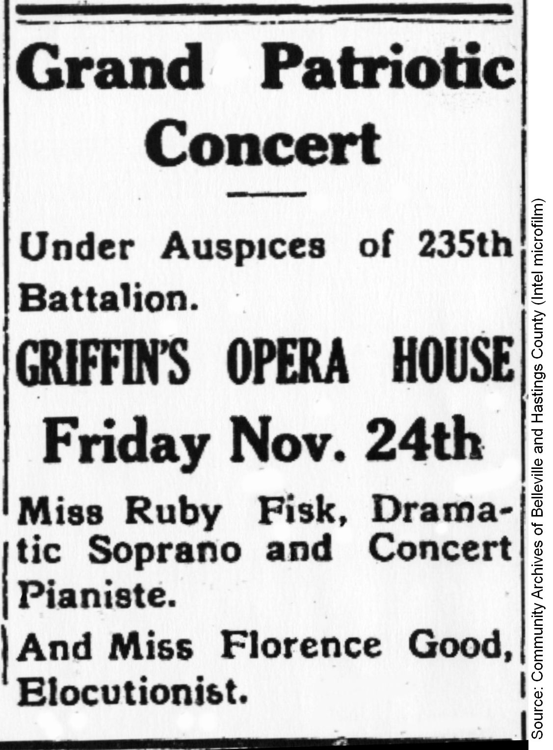 “Grand Patriotic Concert Under Auspices of 235th Battalion. Griffin’s Opera House Friday Nov. 24th. Miss Ruby Fisk, Dramatic Soprano and Concert Pianiste. And Miss Florence Good, Elocutionist.”