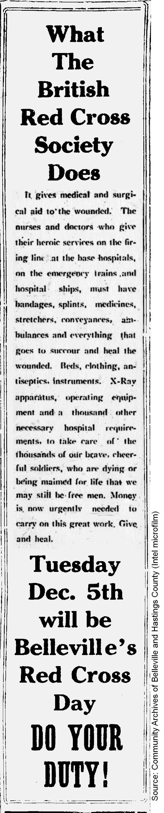 “Every Home To Be Visited. A meeting of the workers in charge of the campaign to raise funds for the British Red Cross Society, was held in the Council Chamber at the City Hall, last evening. His Hon. Judge Wills, presided. The work of organizing was completed, and arrangements made so that every home in Belleville will be visited on Tuesday morning next, December 5th.