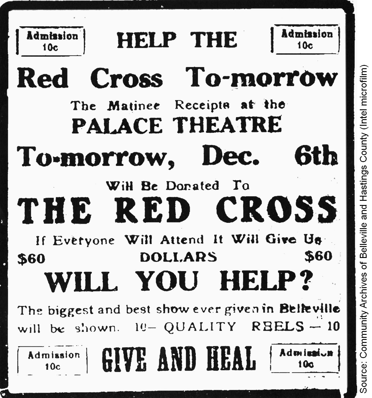 “Help the Red Cross To-morrow. The Matinee Receipts at the Palace Theatre To-morrow, Dec. 6th Will Be Donated To The Red Cross. If Everyone Will Attend It will Give Us $60 Dollars. Will You Help? The biggest and best show ever given in Belleville will be shown. 10—Quality Reels—10. Admission 10c. Give and Heal.”