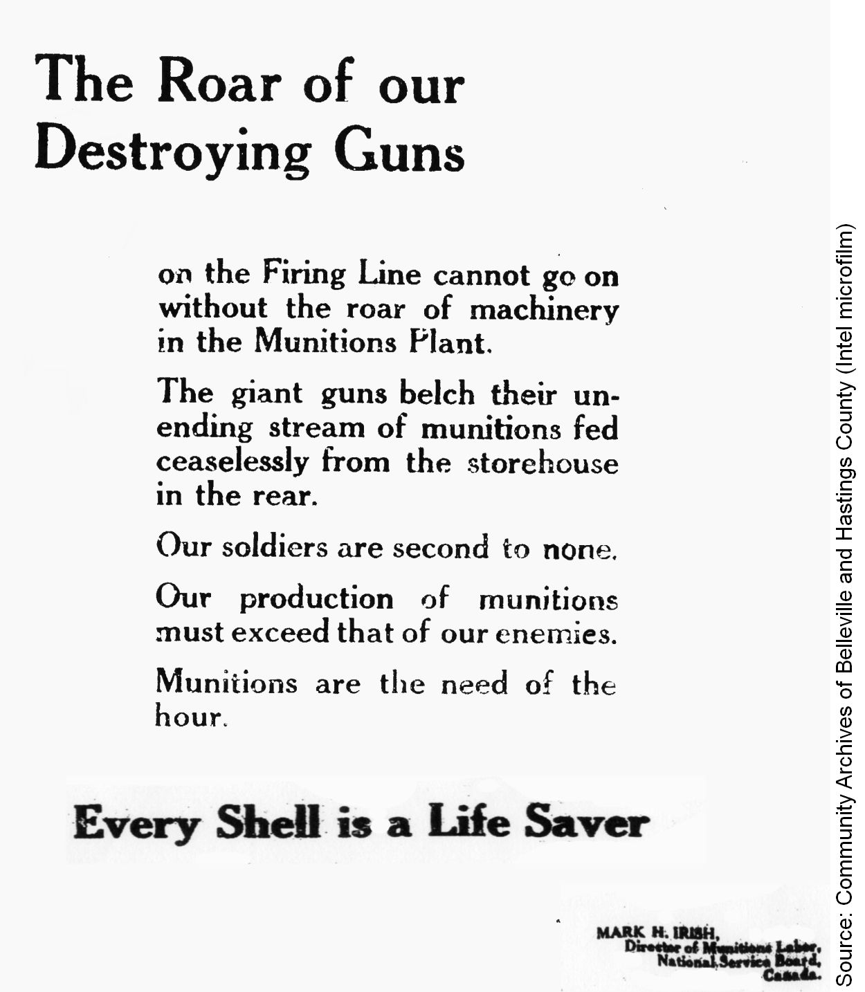 Every Shell is a Life Saver. Mark H. Irish, Director of Munitions Labor, National Service Board, Canada.”