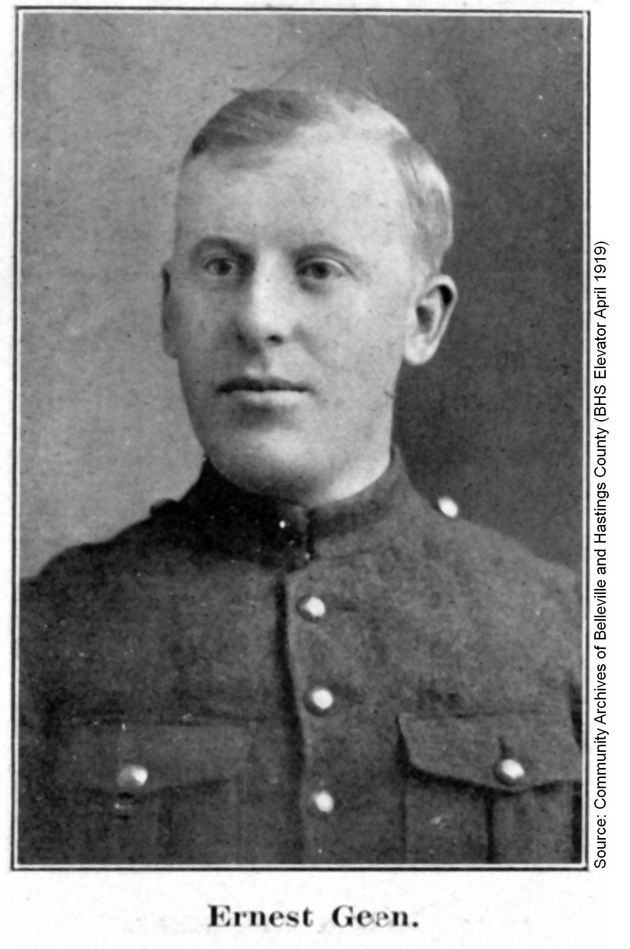 Lieut. Geen, left Belleville as a private in the 21st Battalion, holding rank of Lieut. in the 15th Regt.; by his faithfulness to duty he received his promotion on the field of battle some time ago.”