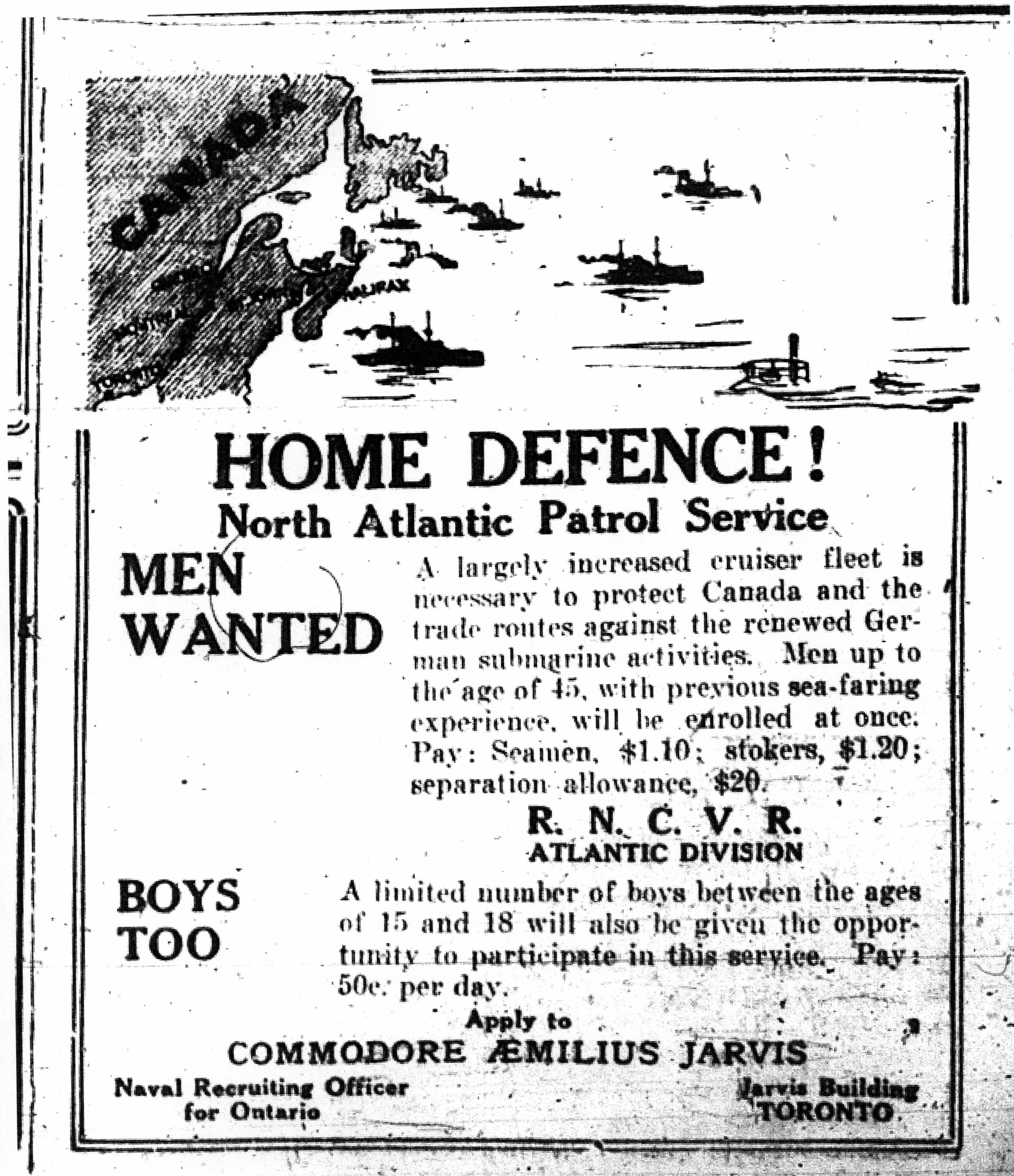 “Home Defence! North Atlantic Patrol Service. Men Wanted. A largely increased cruiser fleet is necessary to protect Canada and the trade routes against the renewed German submarine activities. Men up to the age of 45, with previous sea-faring experience, will be enrolled at once. Pay: Seamen, $1.10; stokers, $1.20; separation allowance, $20.