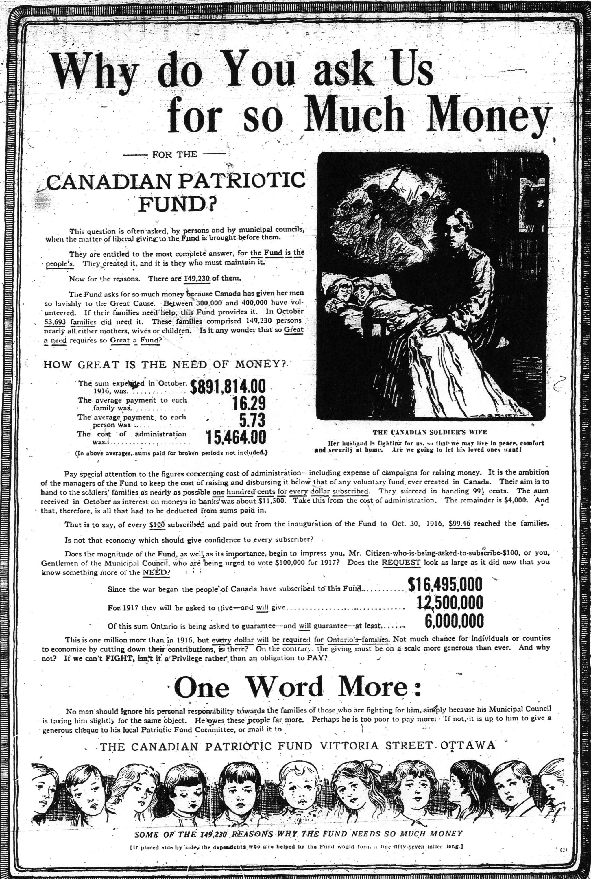“Why do You ask Us for so Much Money for the Canadian Patriotic Fund? This question is often asked, by persons and by municipal councils, when the matter of liberal giving to the Fund is brought before them. … The Fund asks for so much money because Canada has given her men so lavishly to the Great Cause. Between 300,000 and 400,000 have volunteered. If their families need help, this Fund provides it. … Since the war began, the people of Canada have subscribed to this Fund $16,495,000. For 1917 they will be asked to give—and will give $12,500,000. Of this sum, Ontario is being asked to guarantee—and will guarantee—at least $6,000,000.