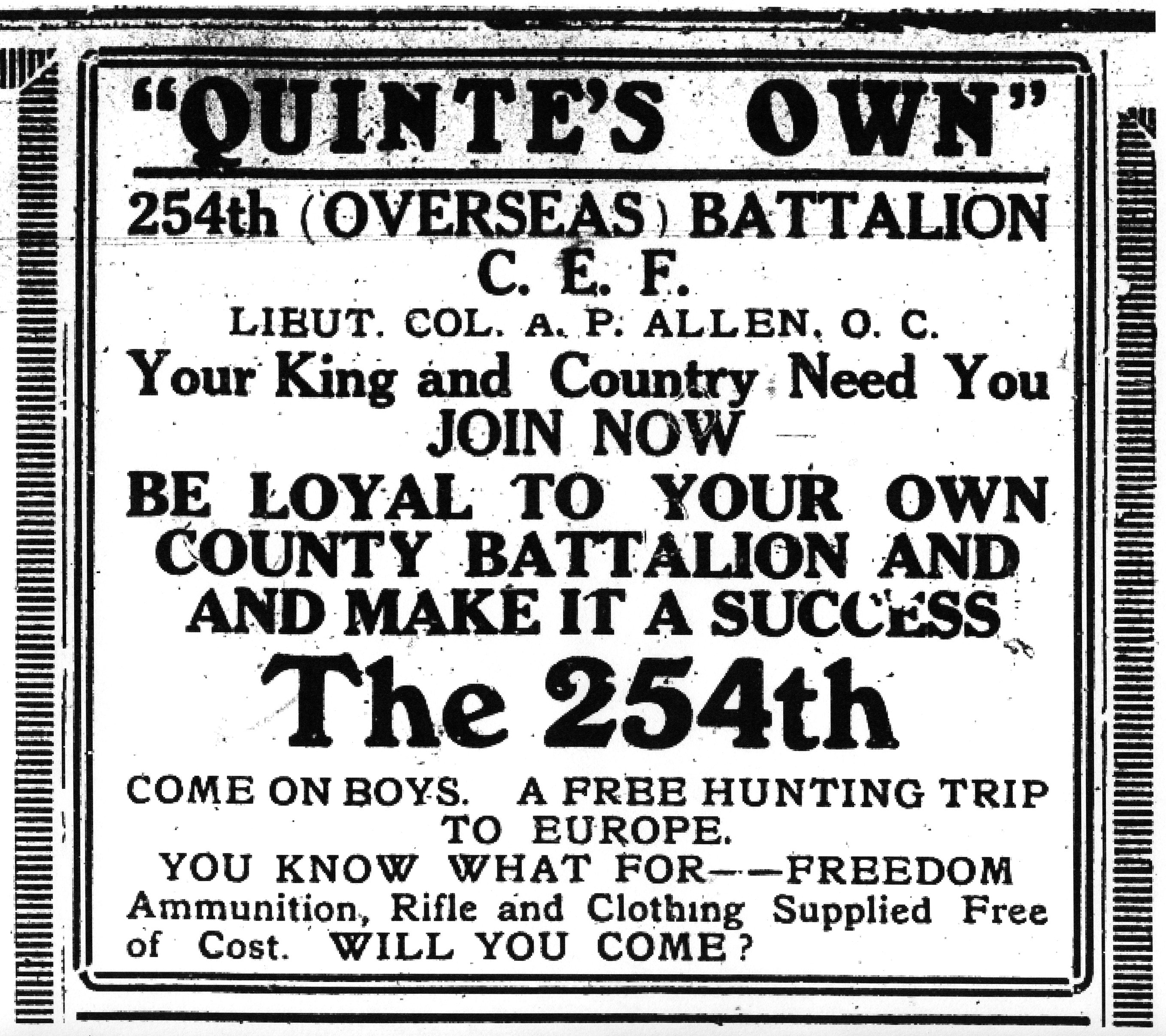 ” ‘Quinte’s Own’ 254th (Overseas) Battalion C. E. F. Lieut. Col. A. P. Allen, O. C.