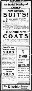 “Ritchie’s. An Initial Display of Ladies’ New Spring Suits! In Our Centre Window.