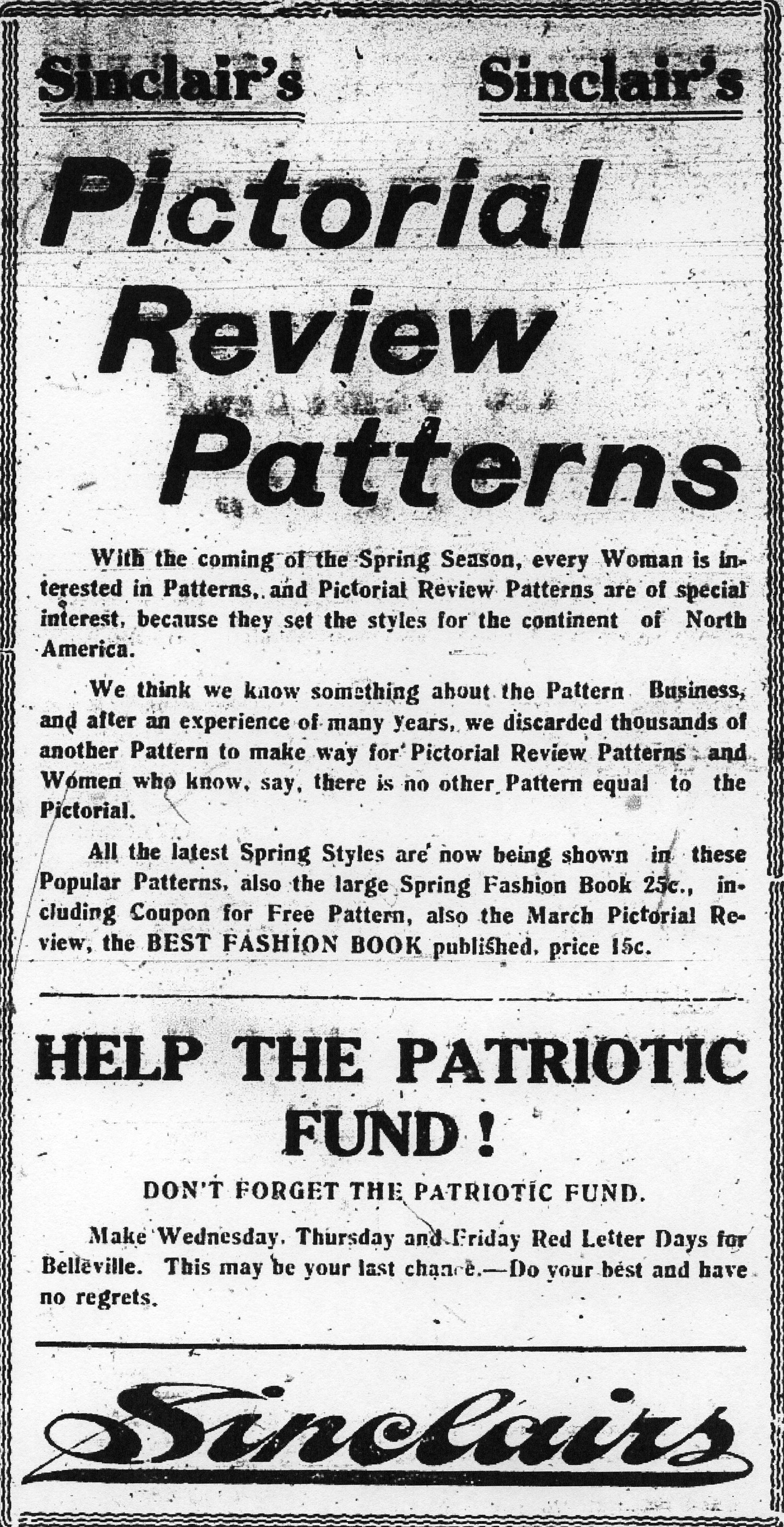 “Sinclair’s Pictorial Review Patterns. With the coming of the Spring Season, every Woman is interested in Patterns, and Pictorial Review Patterns are of special interest, because they set the styles for the continent of North America.