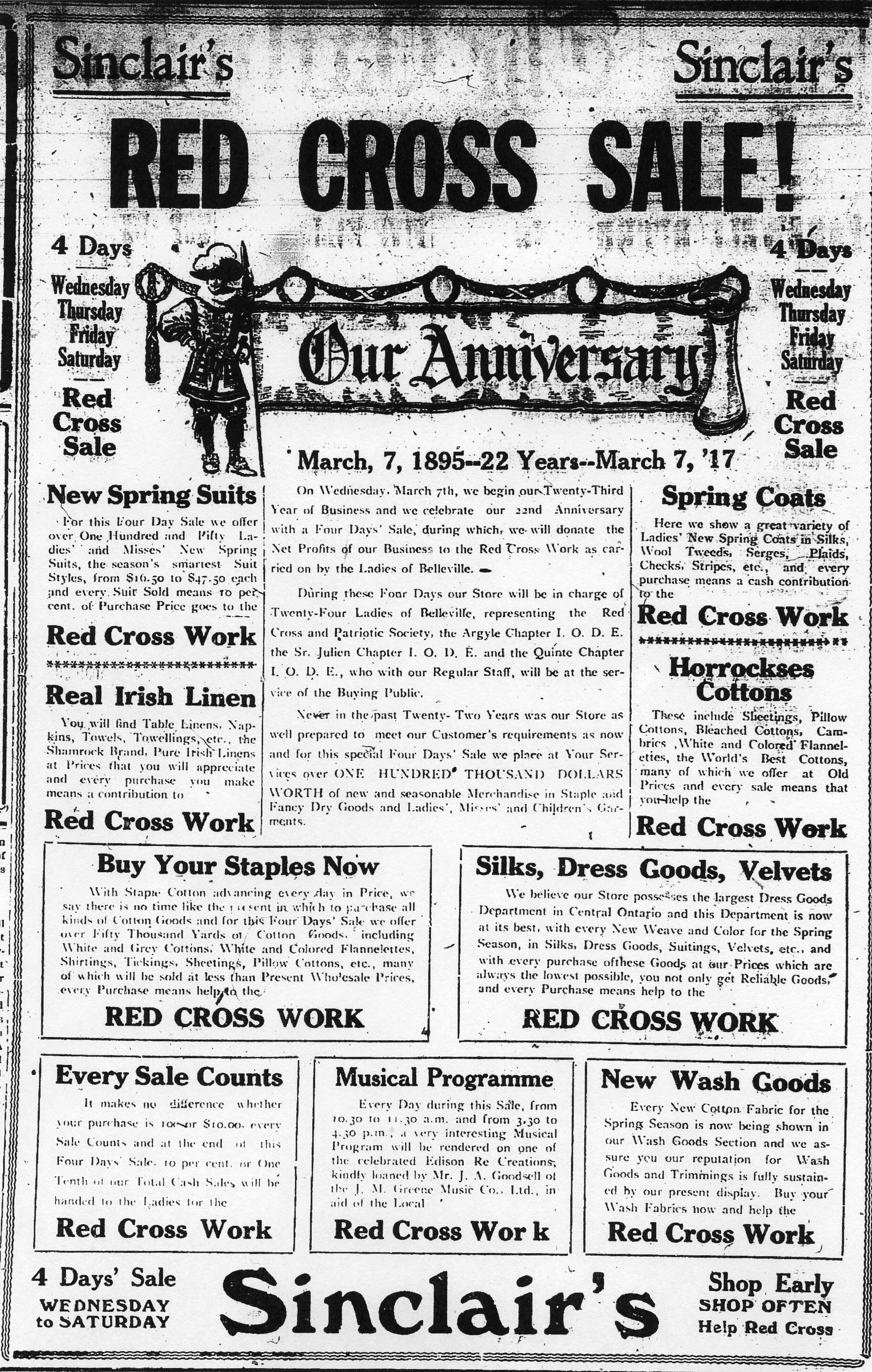 On Wednesday, March 7th, we begin our Twenty-Third Year of Business and we celebrate our 22nd Anniversary with a Four Days’ Sale, during which, we will donate the Net Profits of our Business to the Red Cross Work as carried on by the Ladies of Belleville.”