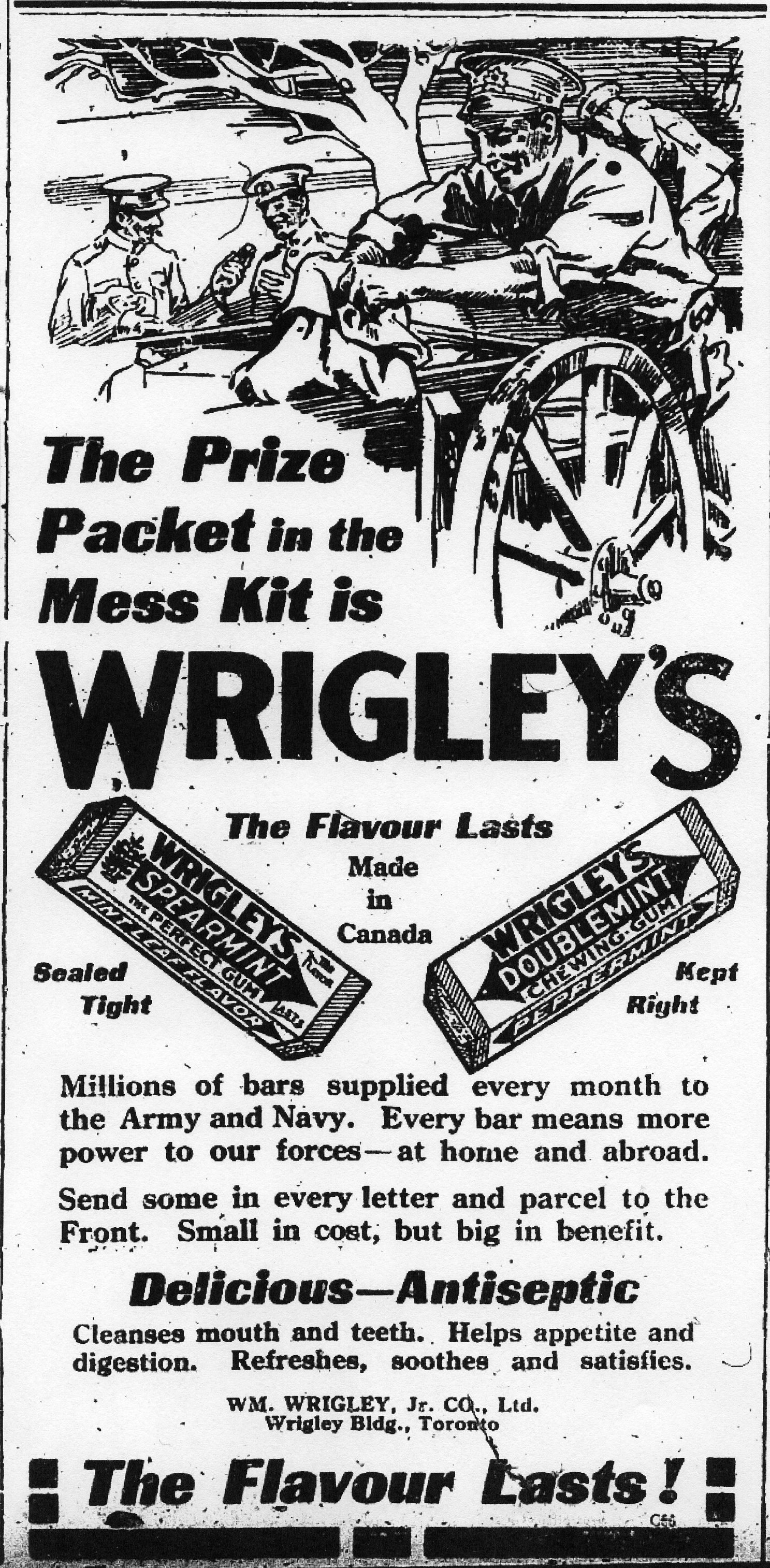 “The Prize Packet in the Mess Kit is Wrigley’s. Millions of bars supplied every month to the Army and Navy. Every bar means more power to our forces—at home and abroad. Send some in every letter and parcel to the Front. Small in cost, but big in benefit.”