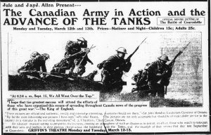 “Jule and Jay J. Allen Present — The Canadian Army in Action and the Advance of the Tanks. Official Moving Pictures of The Battle of Courcelette. Monday and Tuesday, March 12th and 13th. Prices—Matinee and Night—Children 15¢; Adults 25¢.