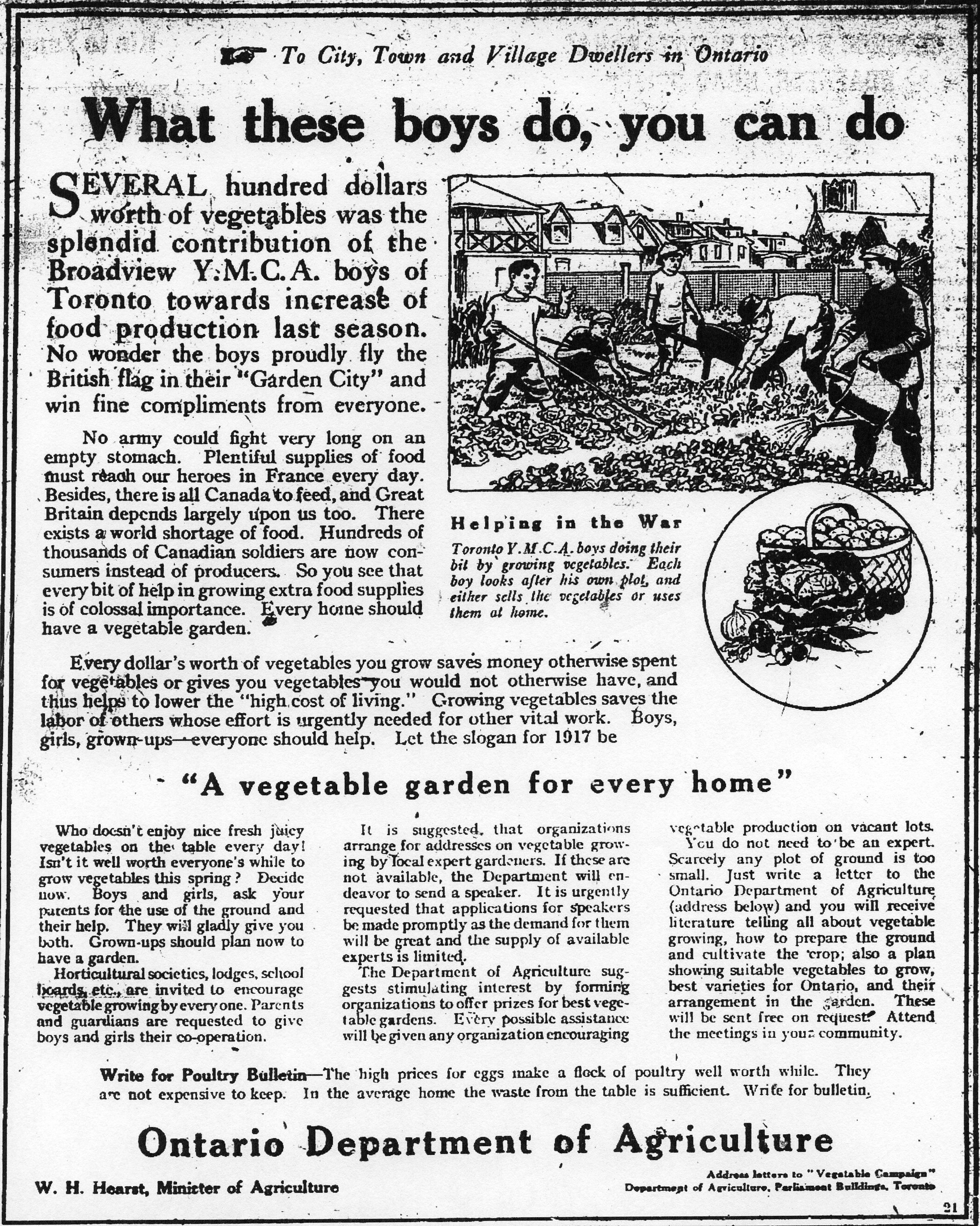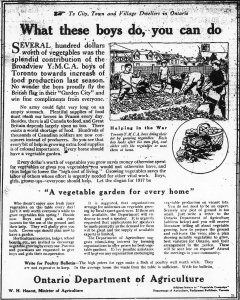“To City, Town and Village Dwellers in Ontario. What these boys do, you can do. Several hundred dollars worth of vegetables was the splendid contribution of the Broadview Y.M.C.A. boys of Toronto towards increase of food production last season. No wonder the boys proudly fly the British flag in their ‘Garden City’ and win fine compliments from everyone.