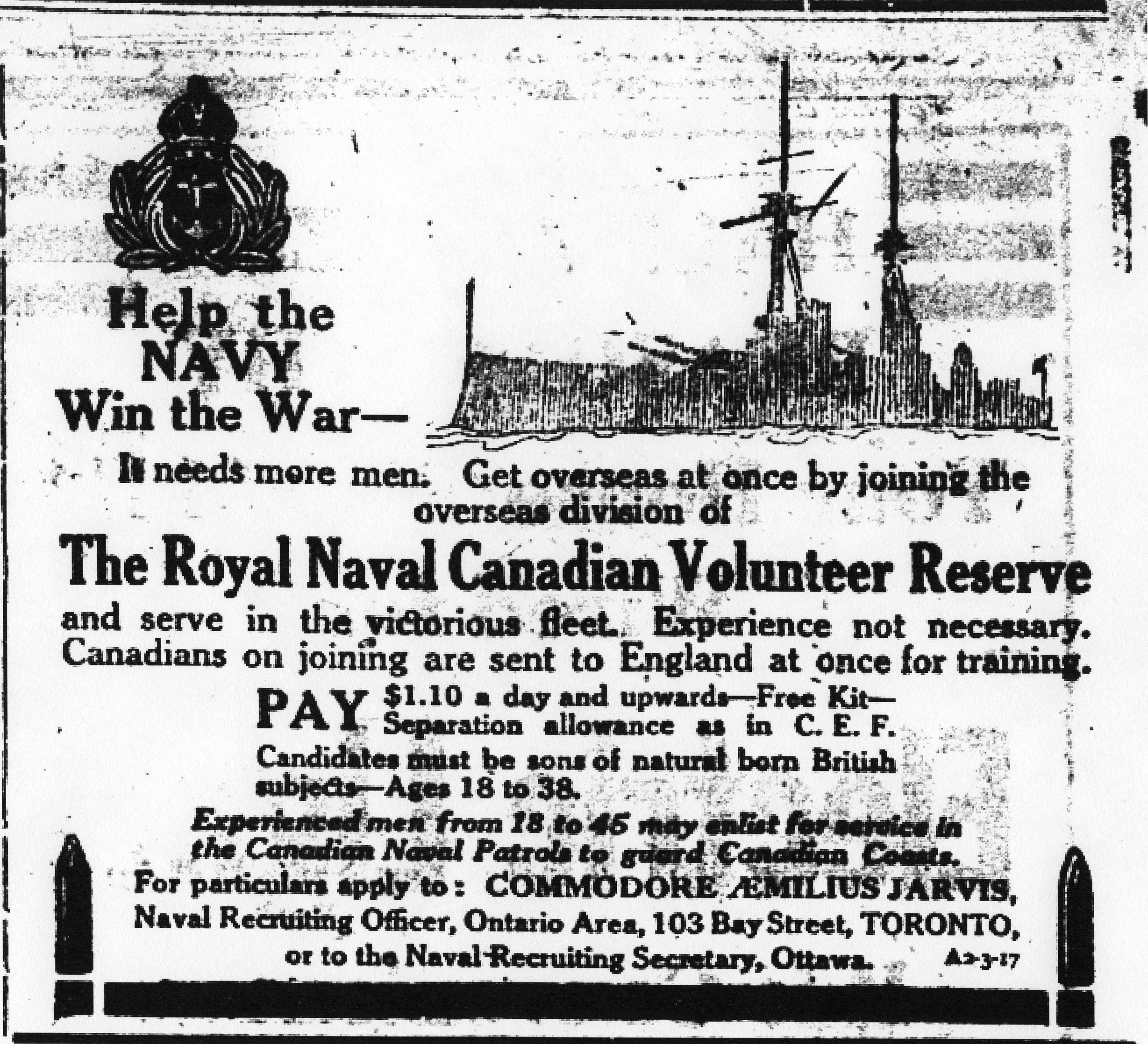 “Help the NAVY Win the War—It needs more men, Get overseas at once by joining the overseas division of The Royal Naval Canadian Volunteer Reserve and serve in the victorious fleet. Experience not necessary. Canadians on joining are sent to England at once for training.