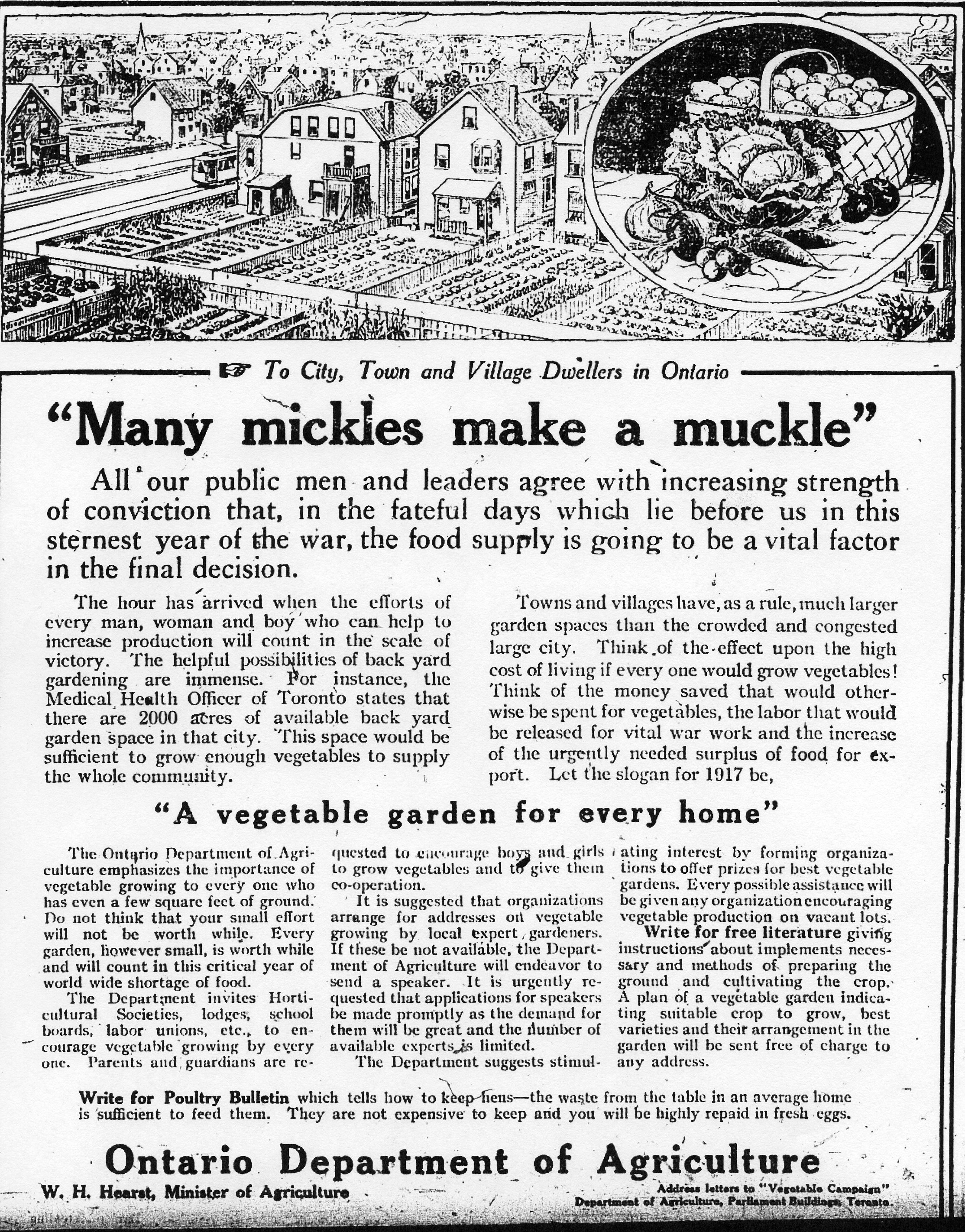 “To City, Town and Village Dwellers in Ontario ‘Many mickles make a muckle.’ … The hour has arrived when the efforts of every man, woman and boy who can help to increase production will count in the scale of victory. The helpful possibilities of back yard gardening are immense.