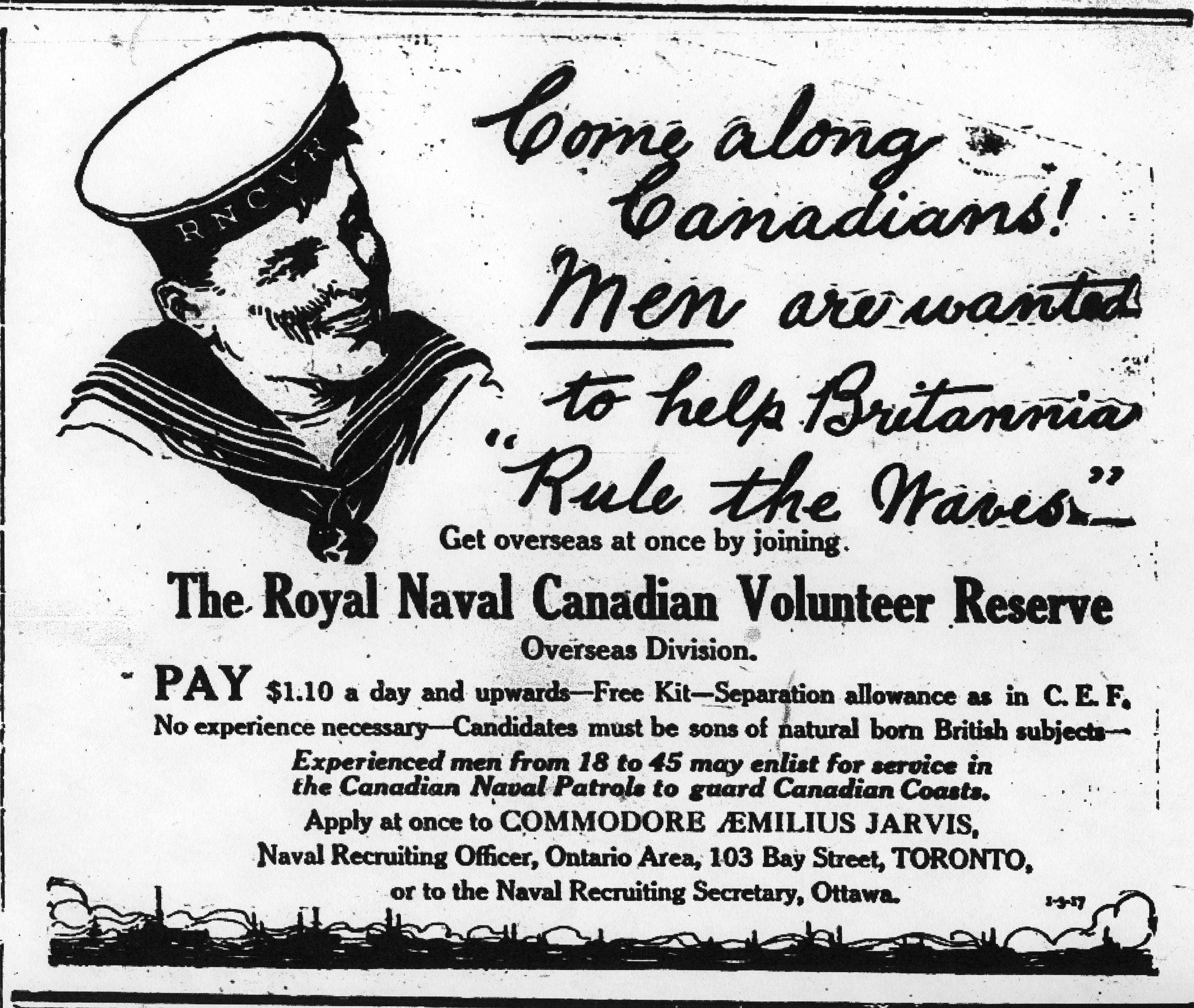 “Come along Canadians! Men are wanted to help Britannia ‘Rule the Waves.’ Get overseas at once by joining The Royal Naval Canadian Volunteer Reserve Overseas Division. …