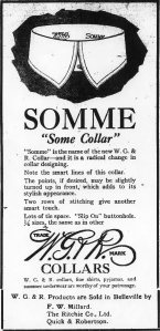 “SOMME ‘Some Collar’ ‘Somme’ is the name of the new W.G. & R Collar—and it is a radical change in collar designing. Note the smart lines of this collar. The points, if desired, may be slightly turned up in front, which adds to its stylish appearance. Two rows of stitching give another smart touch. Lots of tie space. ‘Slip On’ buttonhole. W.G. & R. Products are Sold in Belleville by F. W. Millard, The Ritchie Co., Ltd. Quick & Robertson.”