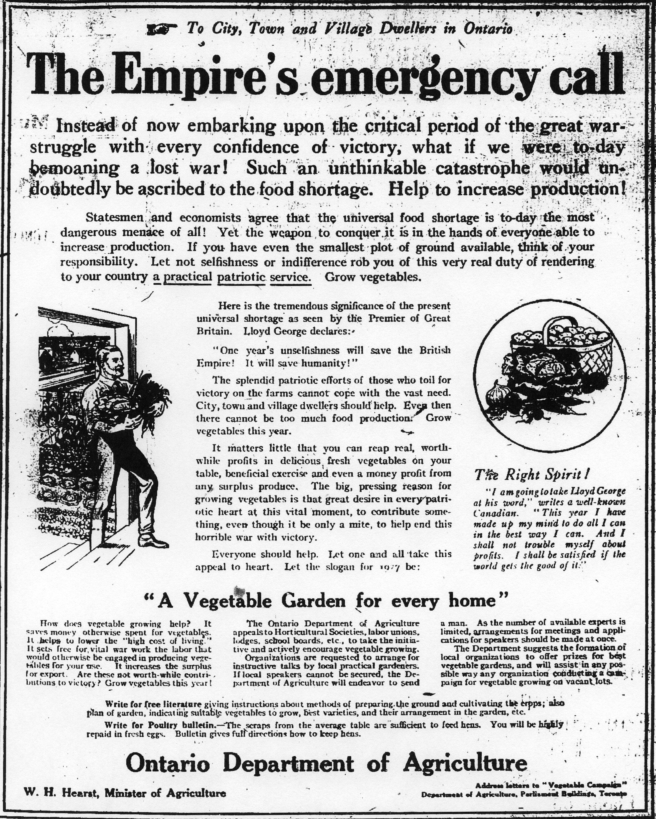 A Vegetable Garden for every home. The Ontario Department of Agriculture appeals to Horticultural Societies, labor unions, lodges, school boards, etc. to take the initiative and actively encourage vegetable growing.”