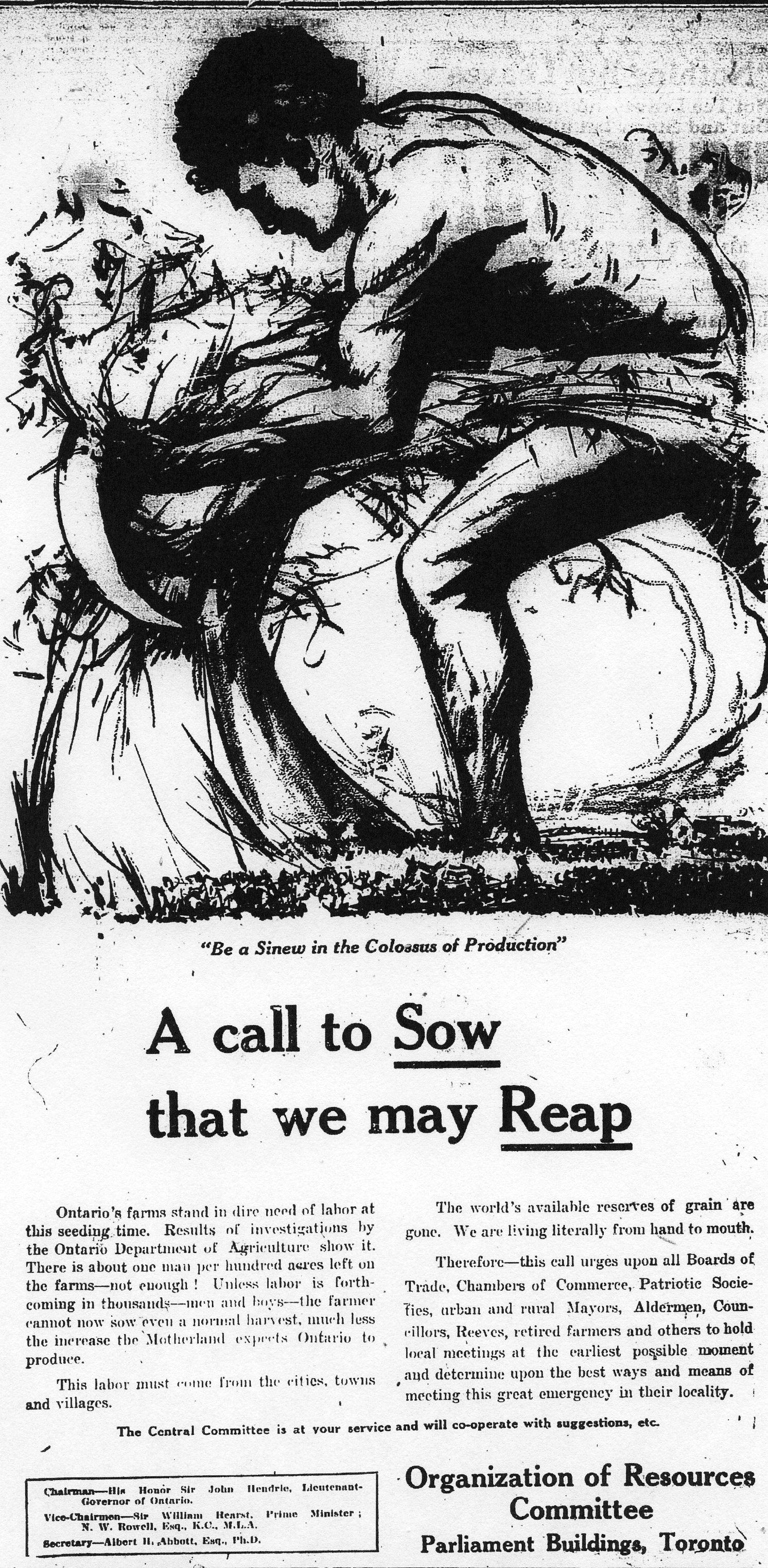 “Be a Sinew in the Colossus of Production. A call to Sow that we may Reap. Ontario’s farms stand in dire need of labor at this seeding time. …