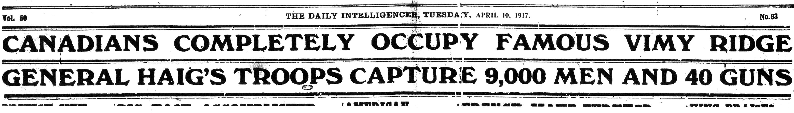 “Canadians Completely Occupy Famous Vimy Ridge. General Haig’s Troops Capture 9,000 Men and 40 Guns.”