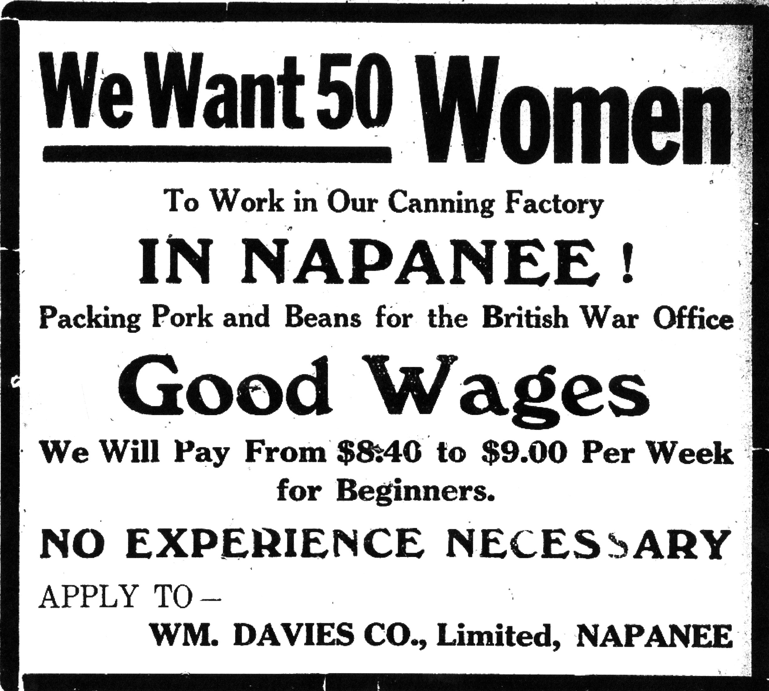 “We Want 50 Women To Work in Our Canning Factory in Napanee! Packing Pork and Beans for the British War Office. Good Wages. We Will Pay from $8.40 to $9.00 Per Week for Beginners. No Experience Necessary. Appy to—Wm. Davies Co., Limited, Napanee.”