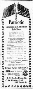 “Patriotic Canadian and American Selections. Our cousins across the border have joined hands with us to fight for freedom. Hear their favorite patriotic music—as well as your own—on Victor Records. … J. V. Doyle, Front St. C. W. Lindsay, Ltd. 231 Front St.”