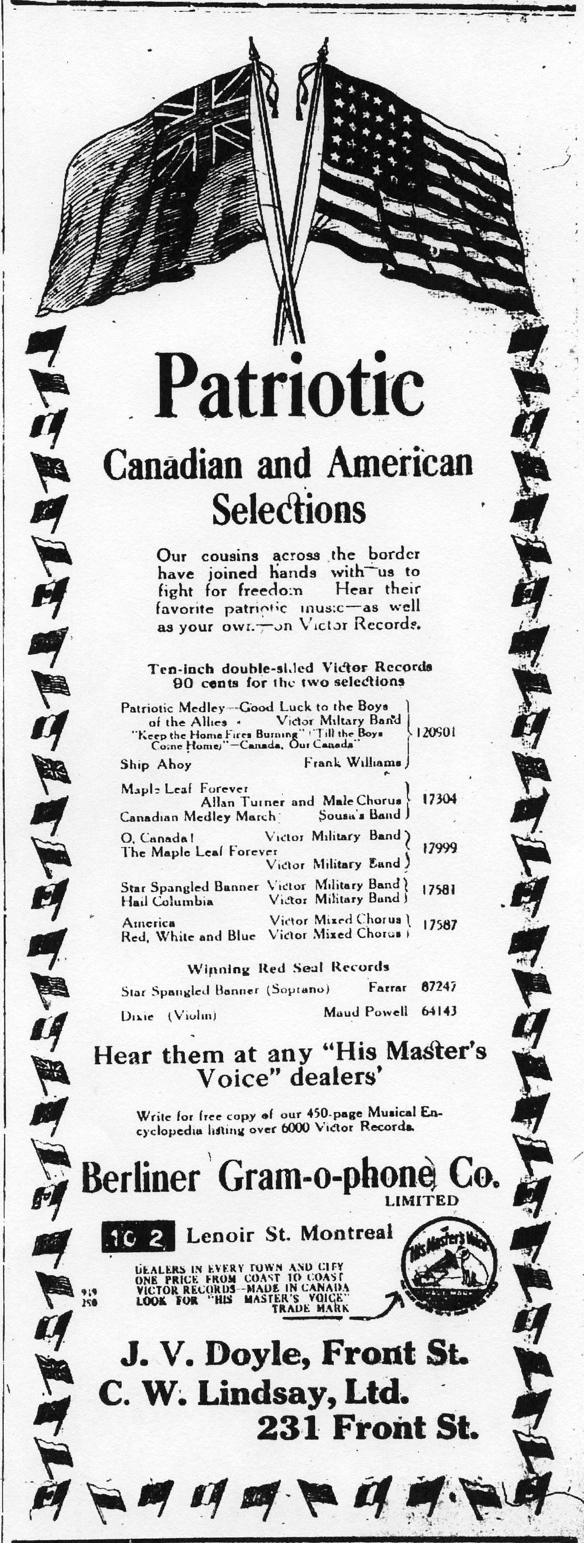 “Patriotic Canadian and American Selections. Our cousins across the border have joined hands with us to fight for freedom. Hear their favorite patriotic music—as well as your own—on Victor Records. … J. V. Doyle, Front St. C. W. Lindsay, Ltd. 231 Front St.”