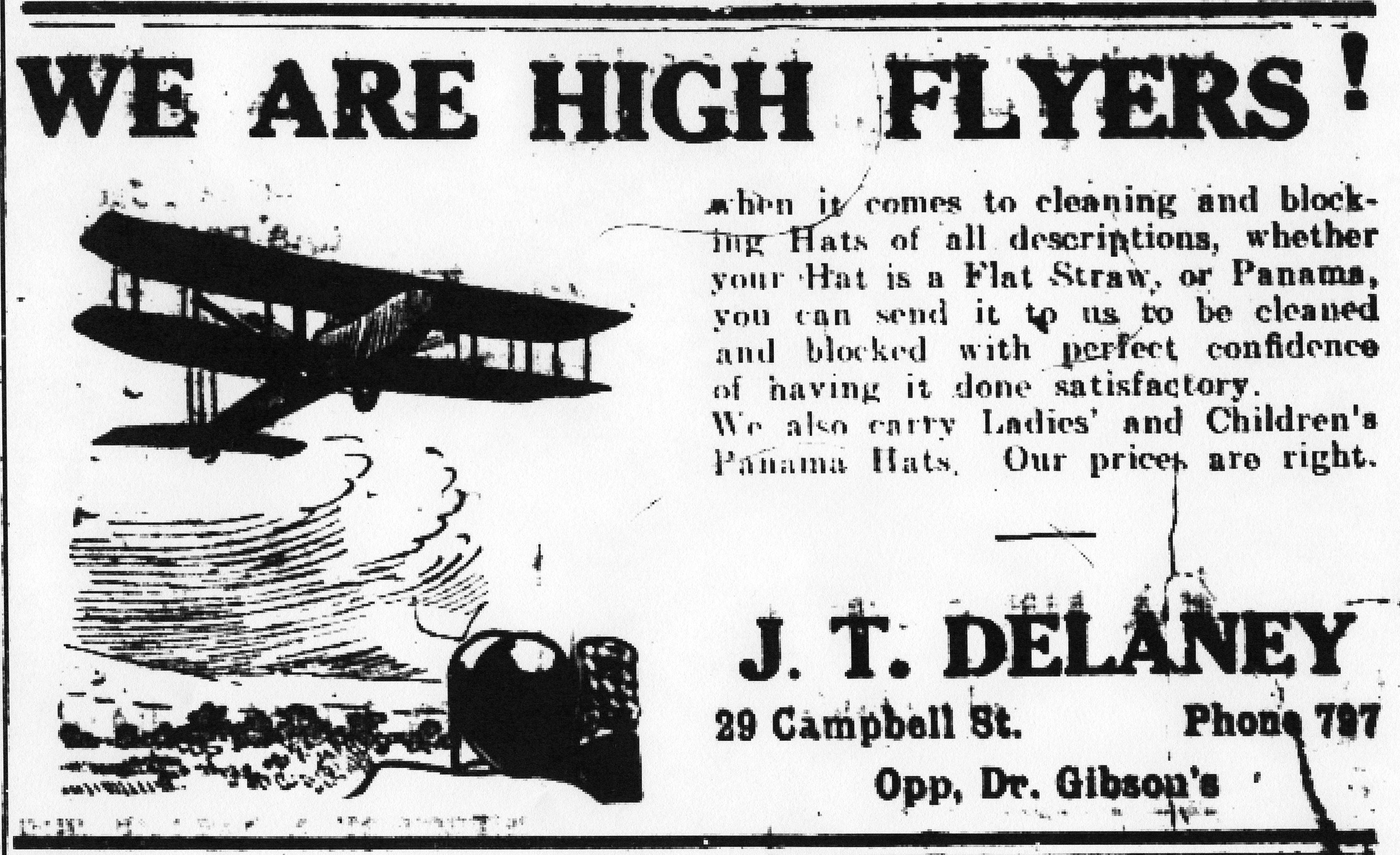 “We Are High Flyers! When it comes to cleaning and blocking Hats of all descriptions, whether your Hat is a Flat Straw, or Panama, you can send it to us to be cleaned and blocked with perfect confidence of having it done satisfactory. We also carry Ladies’ and Children’s Panama Hats. Our prices are right. J. T. Delaney. 29 Campbell St. Phone 797. Opp. Dr. Gibson’s.”