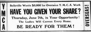“Belleville Wants $5,000 for Overseas Y.M.C.A. Work. Have You Given Your Share? Thursday, June 7th, is Your Opportunity! The Ladies Will Canvas Every Home. Be Ready for Them!”