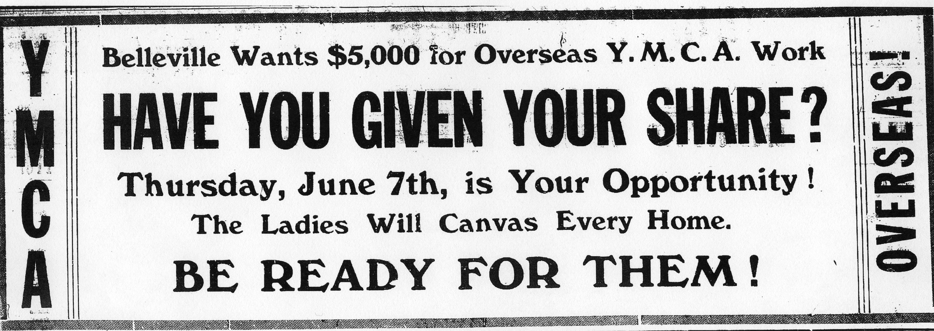 “Belleville Wants $5,000 for Overseas Y.M.C.A. Work. Have You Given Your Share? Thursday, June 7th, is Your Opportunity! The Ladies Will Canvas Every Home. Be Ready for Them!”