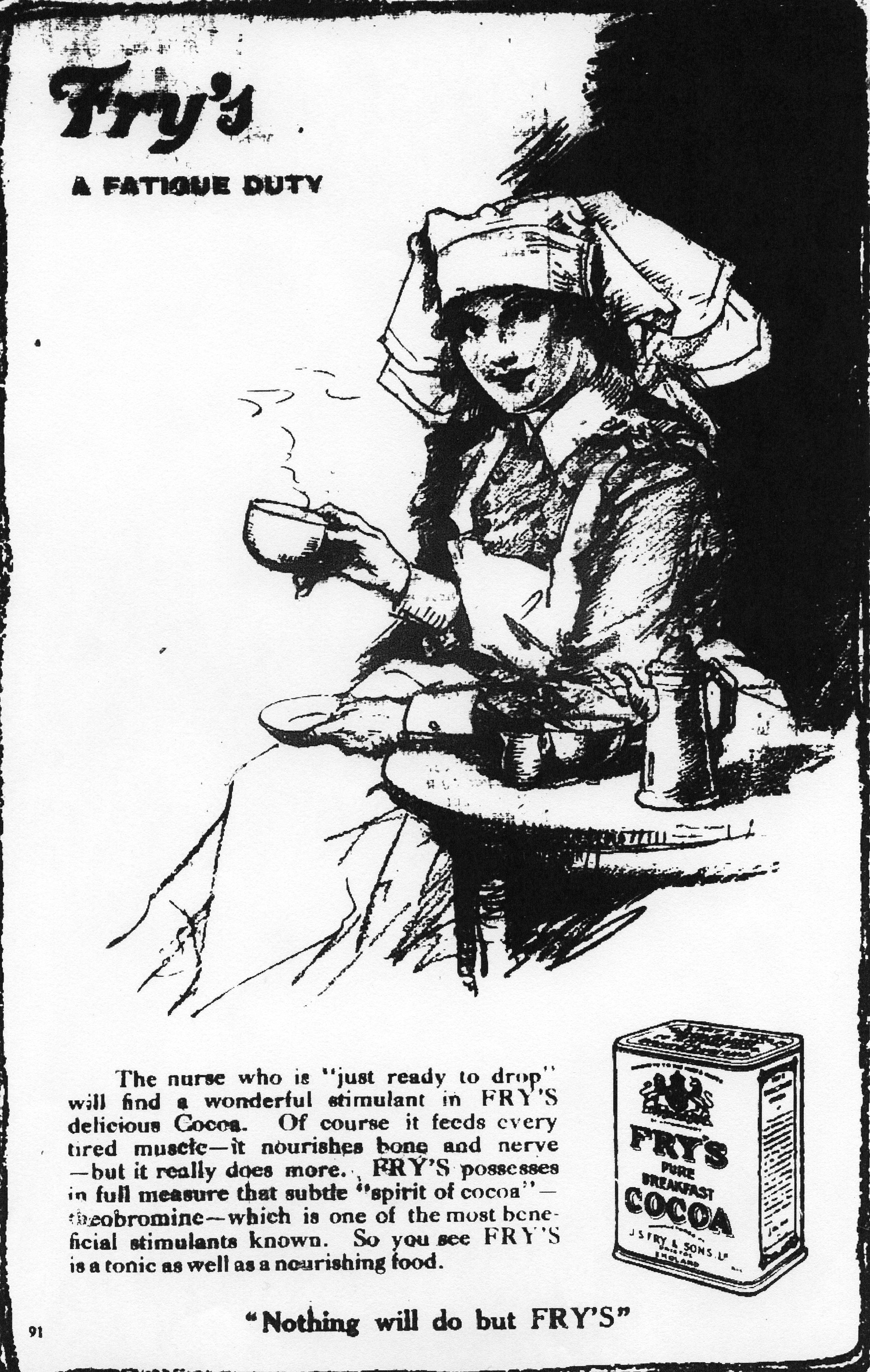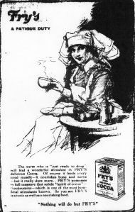 “Fry’s. A Fatigue Duty. The nurse who is ‘just ready to drop’ will find a wonderful stimulant in FRY’S delicious Cocoa. Of course it feeds every tired muscle—it nourishes bone and nerve—but it really does more.