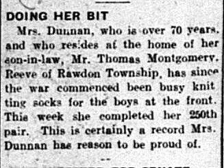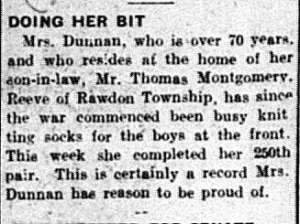 “Doing Her Bit. Mrs. Dunnan, who is over 70 years, and who resides at the home of her son-in-law, Mr. Thomas Montgomery, Reeve of Rawdon Township, has since the war commenced been busy knitting socks for the boys at the front. This week she completed her 250th pair. This is certainly a record Mrs. Dunnan has reason to be proud of.”