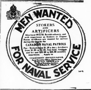 “Men Wanted For Naval Service. Stokers and Artificers. Men from 18 to 60. British subjects, and with experience as Stokers or Engine Room Artificers are wanted for service during the war in the Canadian Naval Patrols.