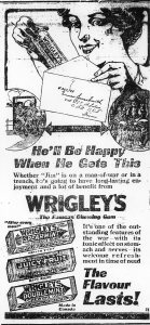 “He’ll Be Happy When He Gets This. Whether ‘Jim’ is on a man-of-war or in a trench, he’s going to have long-lasting enjoyment and a lot of benefit from Wrigley’s. The Famous Chewing Gum. The Flavour Lasts!”