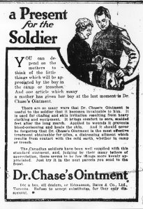 “a Present for the Soldier. You can depend on the mothers to think of the little things which will be appreciated by the boy in the camp or trenches. And one article which many a mother has given her boy at the last moment is Dr. Chase’s Ointment.