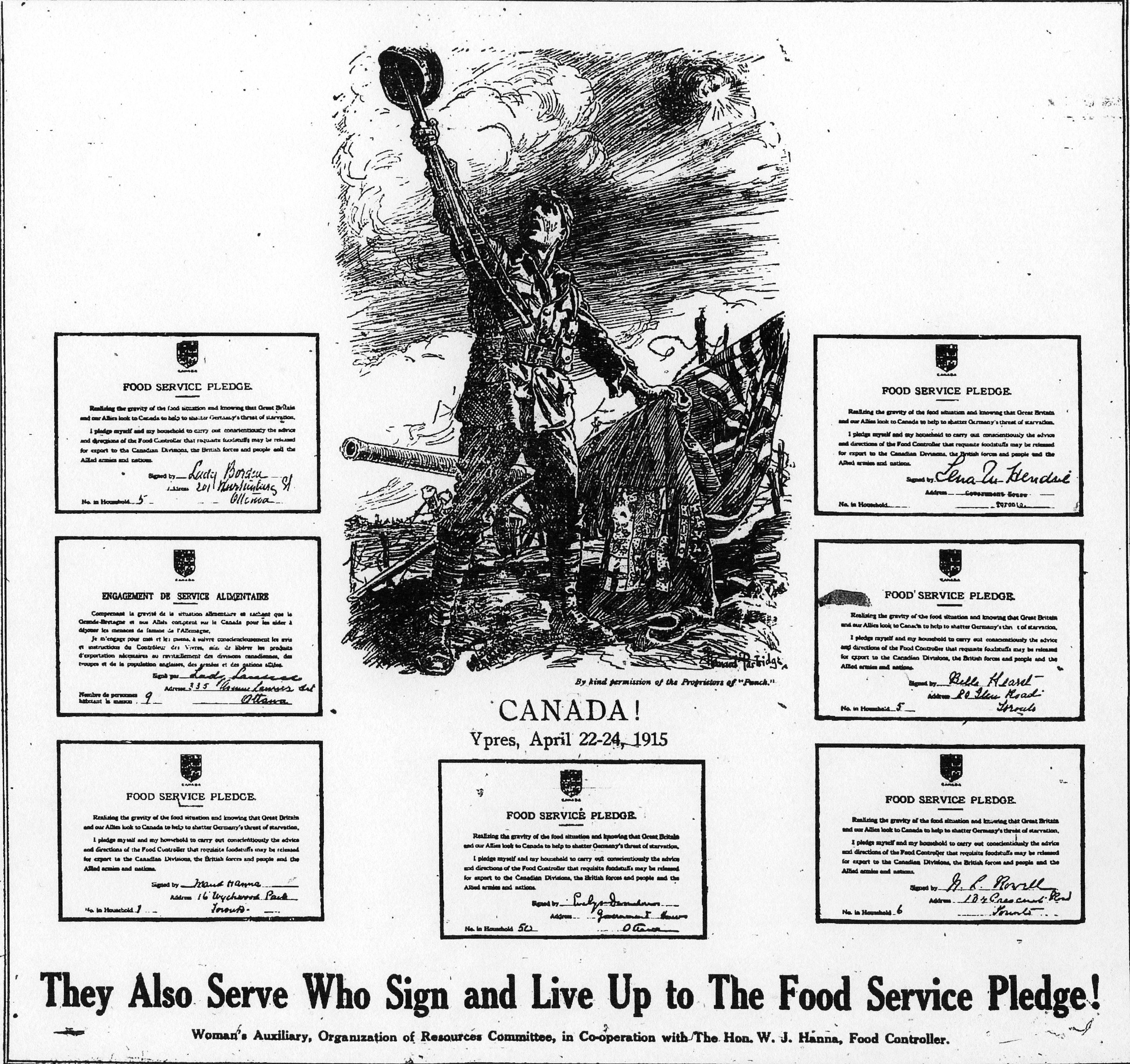 “Canada! Ypres, April 22-24, 1915. They Also Serve Who Sign and Live Up to The Food Service Pledge! Woman’s Auxiliary, Organization of Resources Committee, in Co-operation with The Hon. W. J. Hanna, Food Controller.”