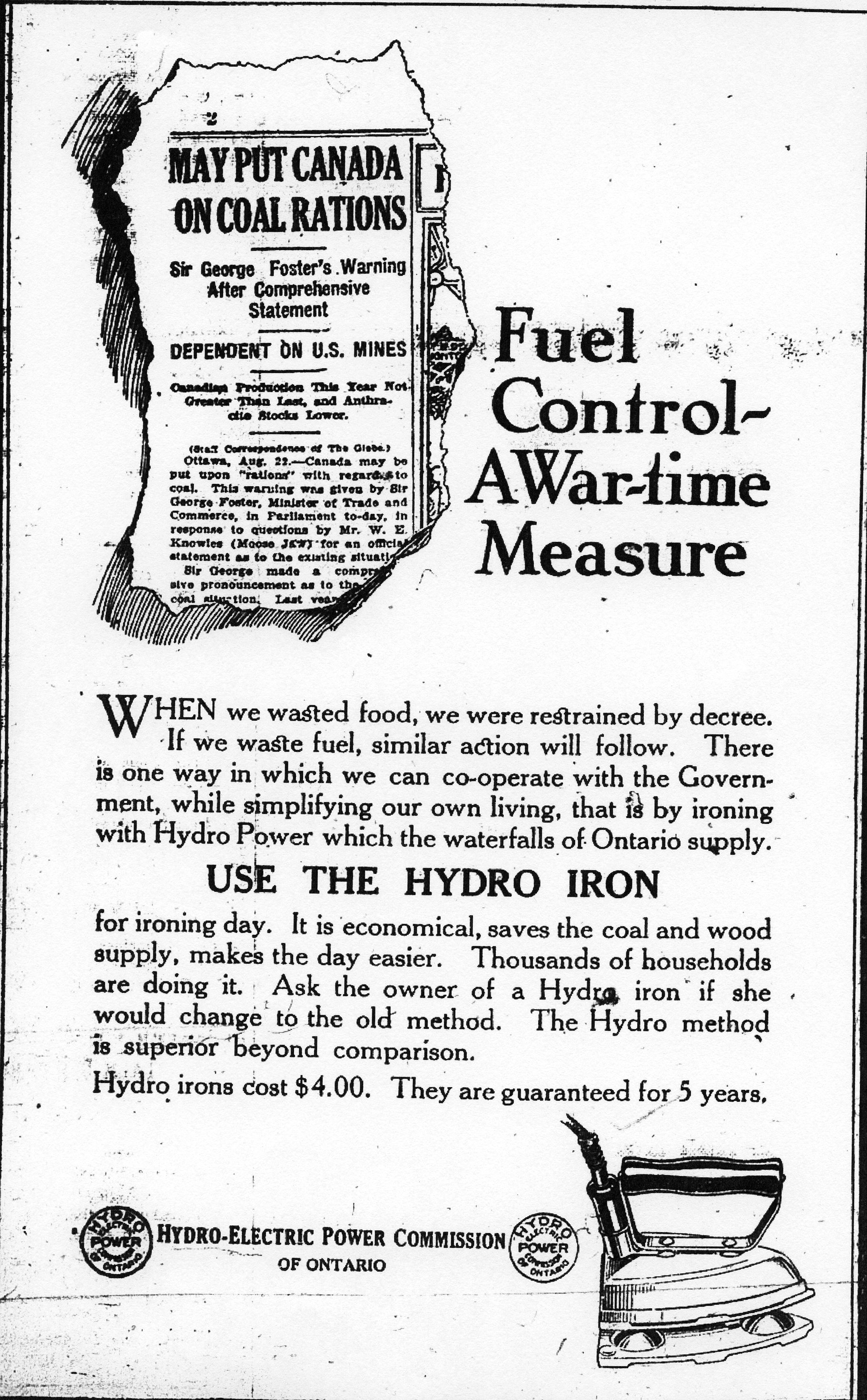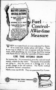“Fuel Control—A War-time Measure. When we wasted food, we were restrained by decree. If we waste fuel, similar action will follow. There is one way in which we can co-operate with the Government, while simplifying our own living, that is by ironing with Hydro Power which the waterfalls of Ontario supply.