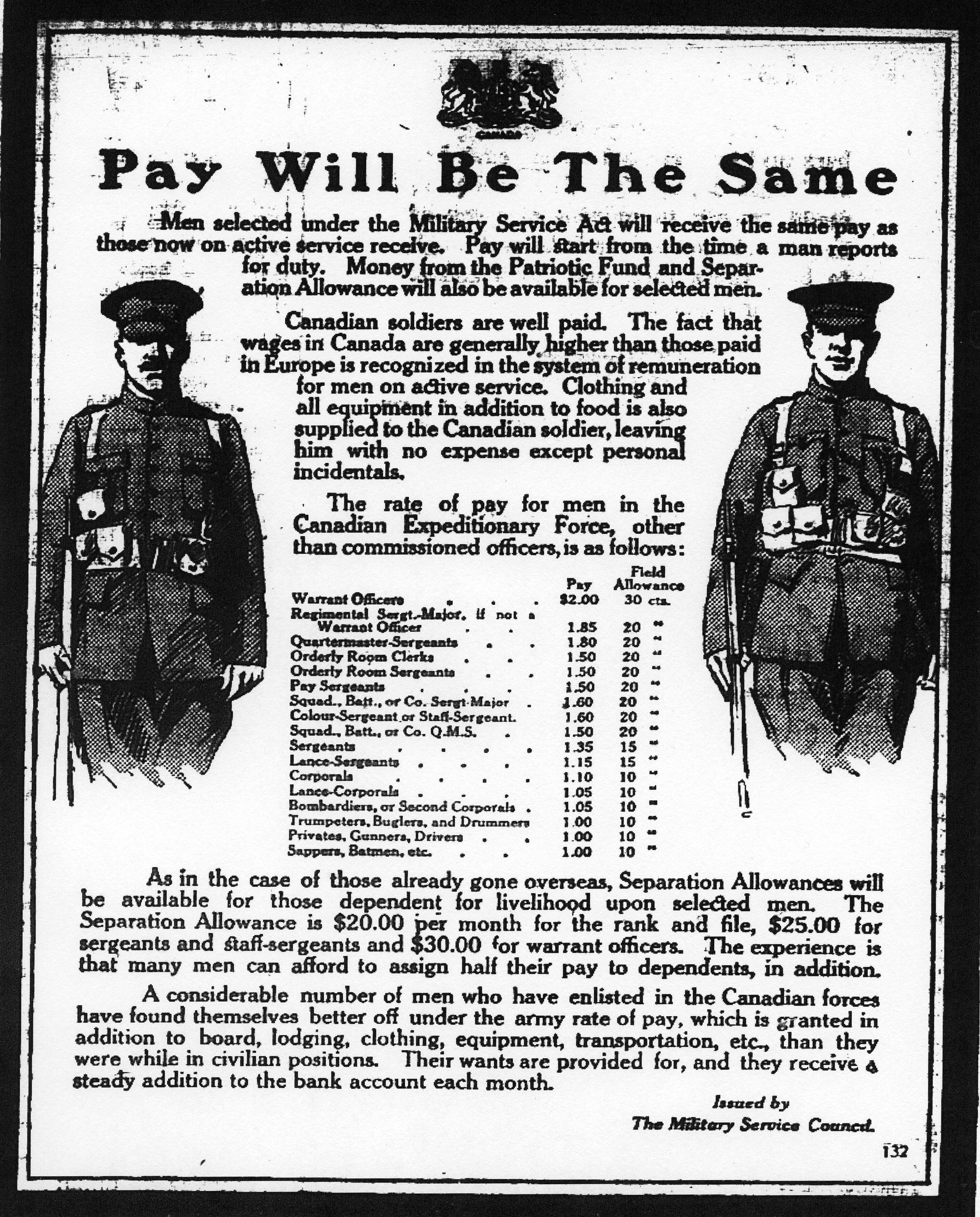 “Pay Will Be The Same. Men selected under the Military Service Act will receive the same pay as those now on active service receive. Pay will start from the time a man reports for duty. Money from the Patriotic Fund and Separation Allowance will also be available for selected men.