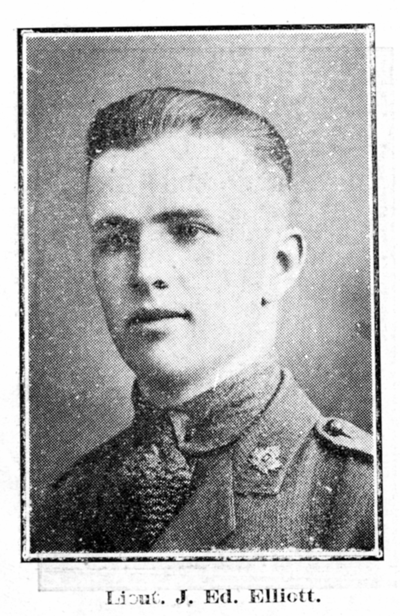 “Lieut. Elliott Home. Lieut. Eddie Elliott, second son of Mr. John Elliott, manager of the Standard Bank, Belleville, arrived home on Thursday afternoon and was very heartily welcome. Lieutenant Elliott left here with the 80th Battalion, and later being transferred to the front, was associated with the 54th.