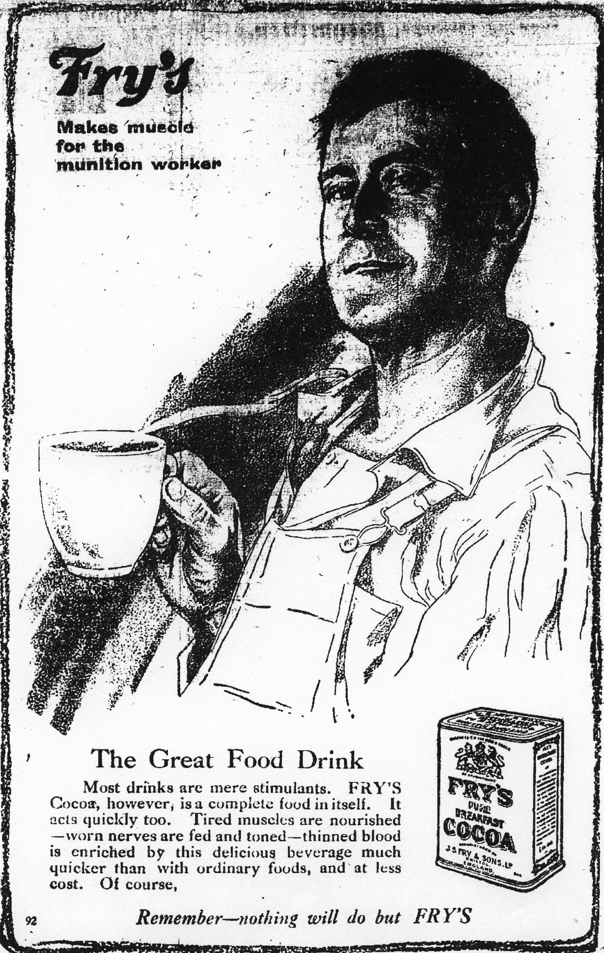 “Fry’s Makes muscle for the munition worker. The Great Food Drink. Most drinks are mere stimulants. FRY’S Cocoa, however, is a complete food in itself. It acts quickly too. Remember—nothing will do but FRY’S.”