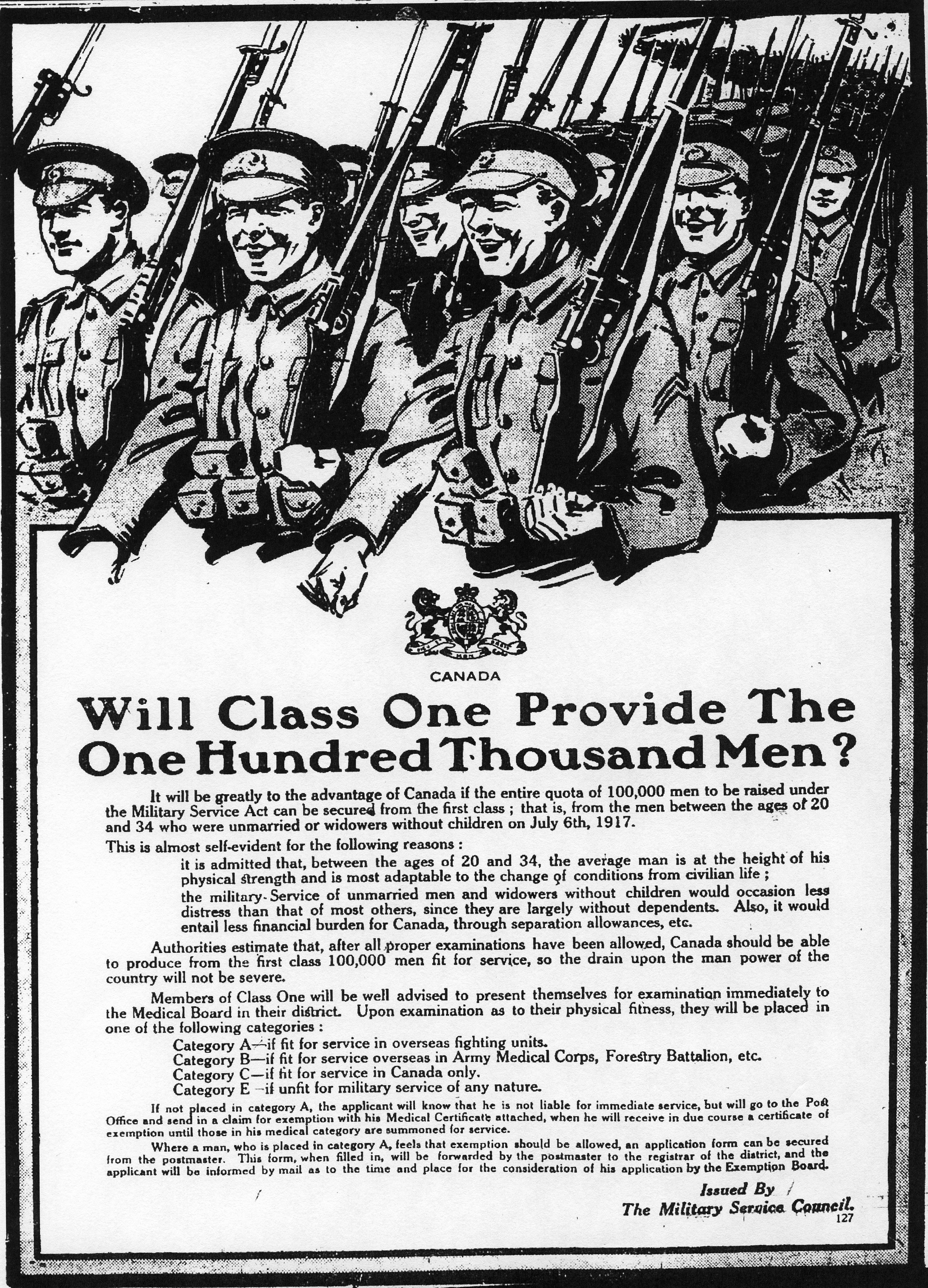 It will greatly be to the advantage of Canada if the entire quota of 100,000 men to be raised under the Military Service Act can be secured from the first class; that is, from the men between the ages of 20 and 34 who were unmarried or widowers without children on July 6th, 1917.