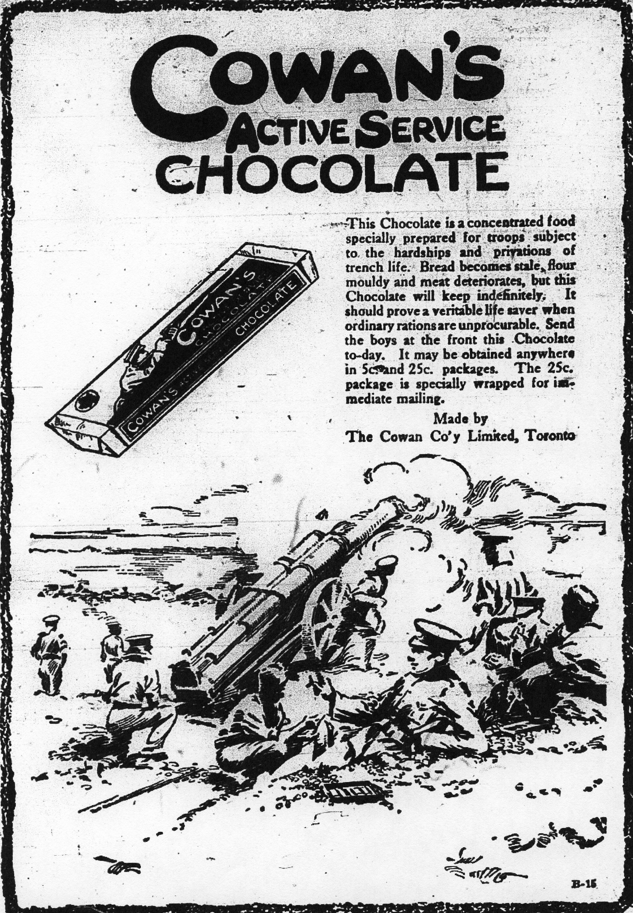 “Cowan’s Active Service Chocolate. This Chocolate is a concentrated food specially prepared for troops subject to the hardships and privations of trench life.